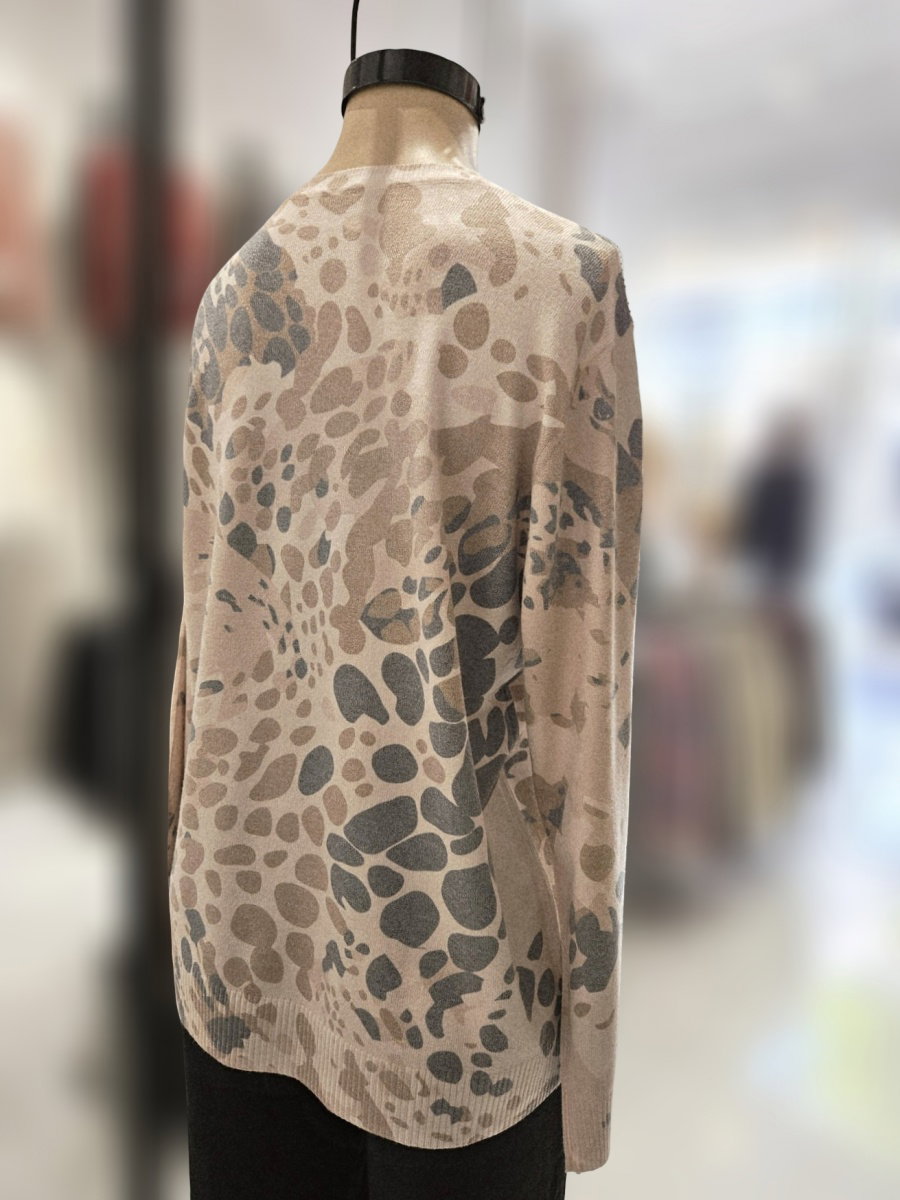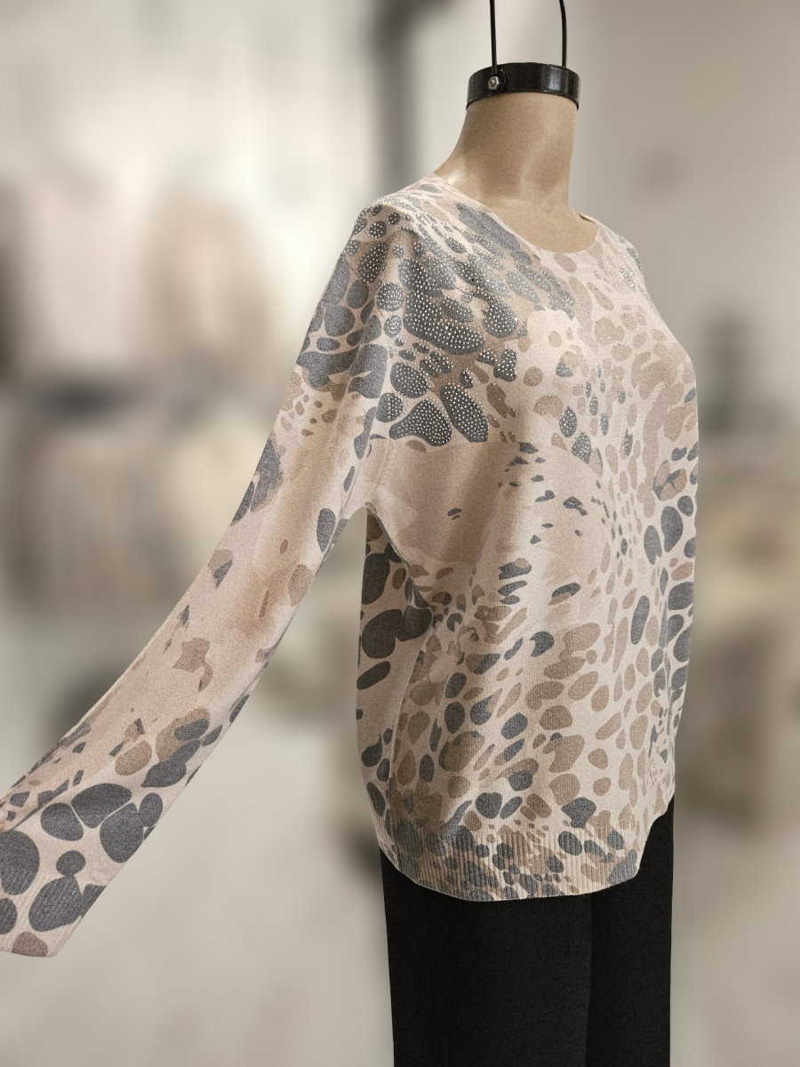 Sweater de tejido fino con estampa sublimada. Cuello redondo con terminación simple. Manga larga con hombro levemente caído. Calce recto y largo a la cadera con ruedo levemente curvo.