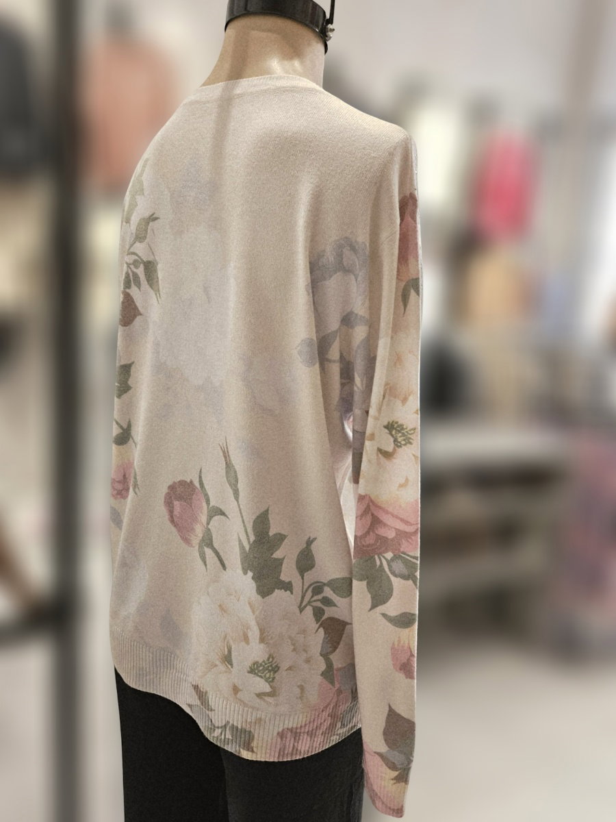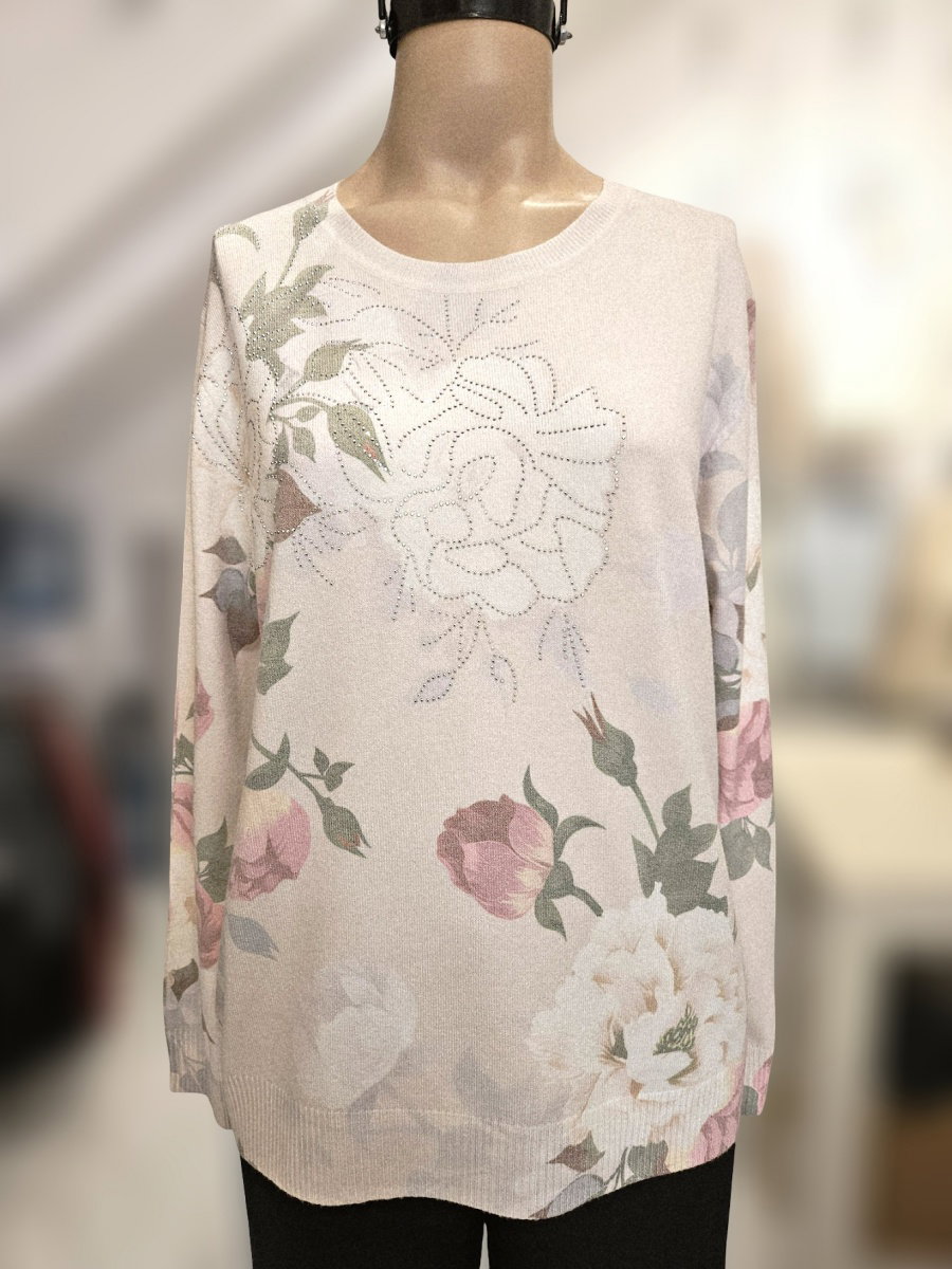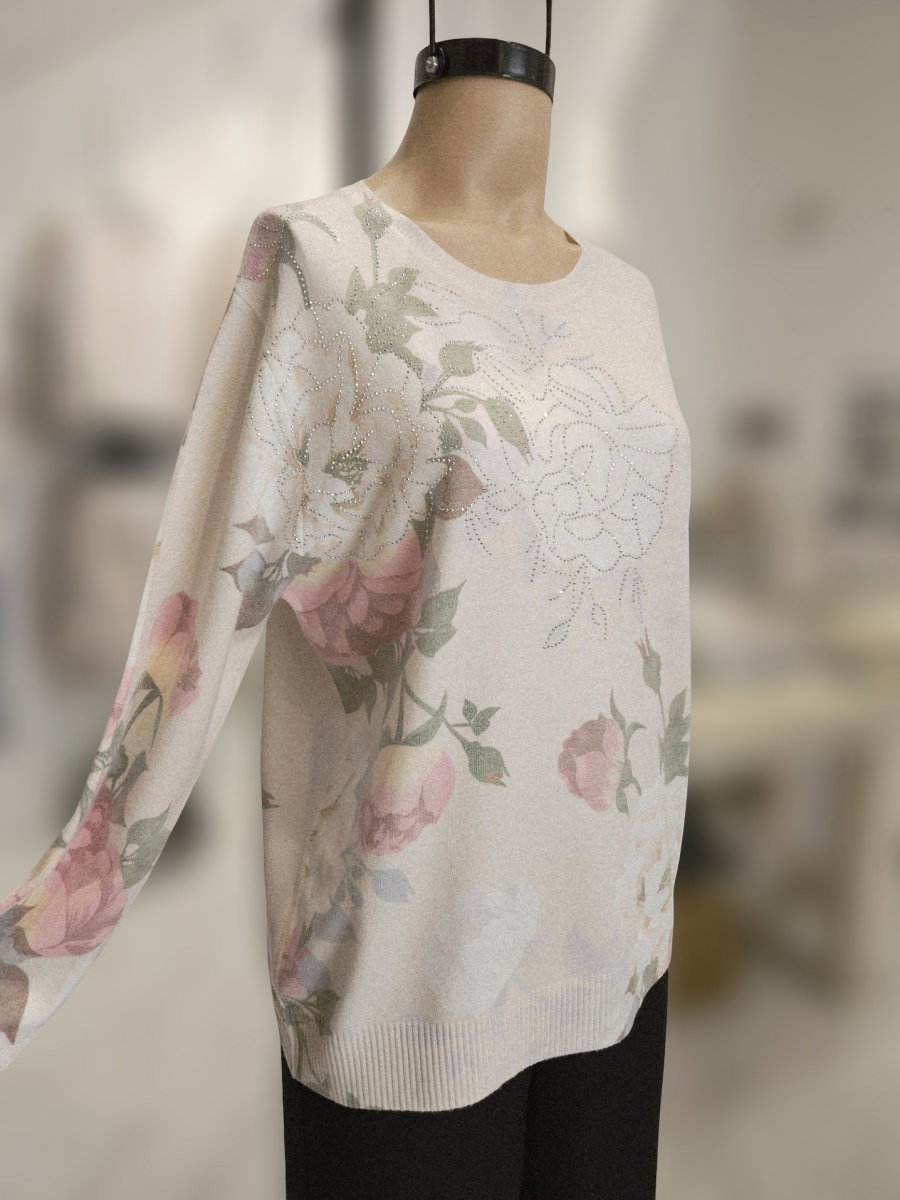 Sweater sublimado de tejido liviano. Presenta cuello redondo, mangas largas y calce recto. Diseño estampado con motivos florales y detalles de strass en el frente. Terminaciones acanaladas en puños y ruedo.