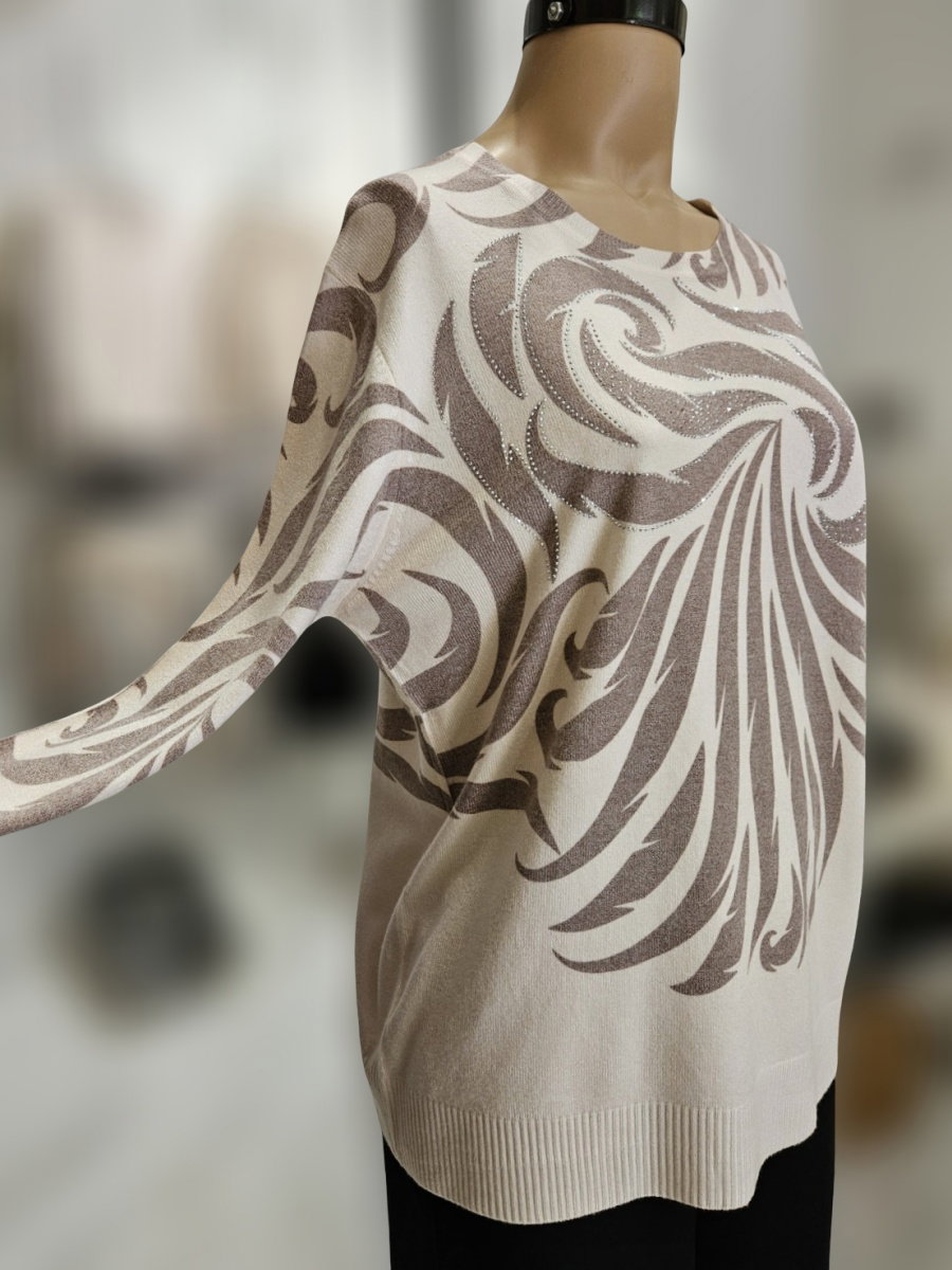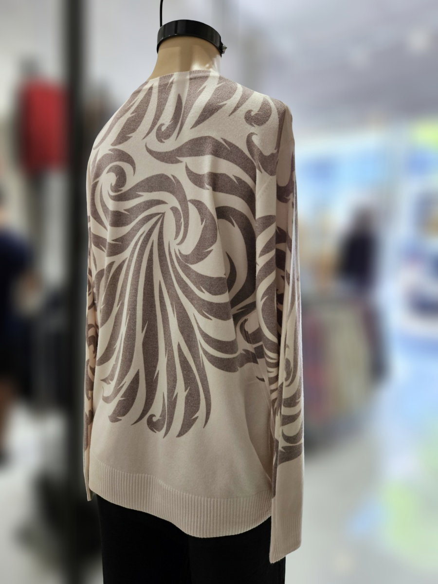 Sweater de tejido liso con estampa integral de motivo orgánico. Cuello redondo con terminación acanalada. Manga larga con caída recta y hombro levemente caído. Diseño continuo en delantero, espalda y mangas. Calce recto y largo a la cadera con ruedo y puños acanalados.