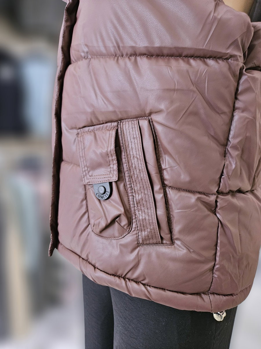 Chaleco acolchado sin mangas con estructura de paneles horizontales. Presenta cuello alto con interior de textura tipo corderito y cierre frontal mediante cremallera cubierta por solapa con broches. Incluye bolsillos delanteros con tapa y botón. Terminaciones rectas con leve ajuste en el borde inferior. Calce recto con volumen.