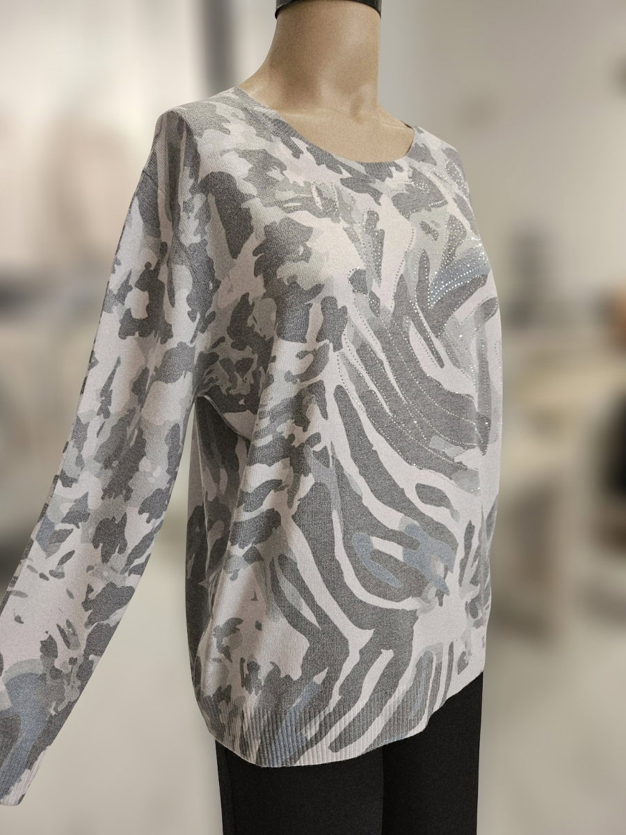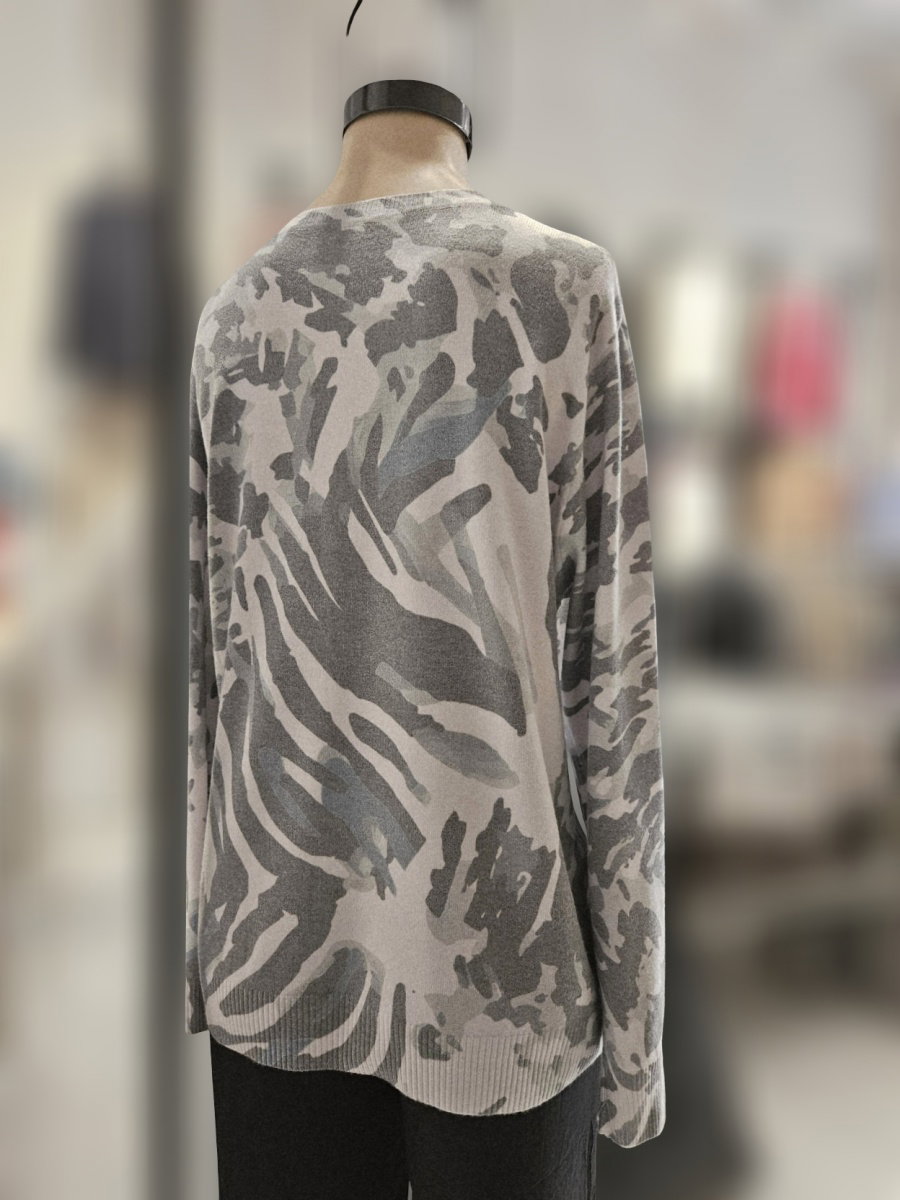 Sweater de tejido fino con estampa sublimada de formas abstractas. Escote redondo, mangas largas y calce recto. Terminaciones en rib en cuello, puños y base. Diseño continuo distribuido en delantero, espalda y mangas.