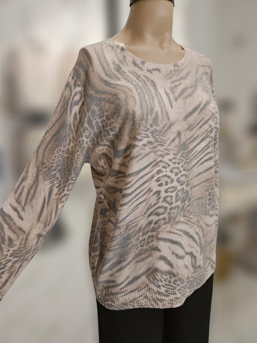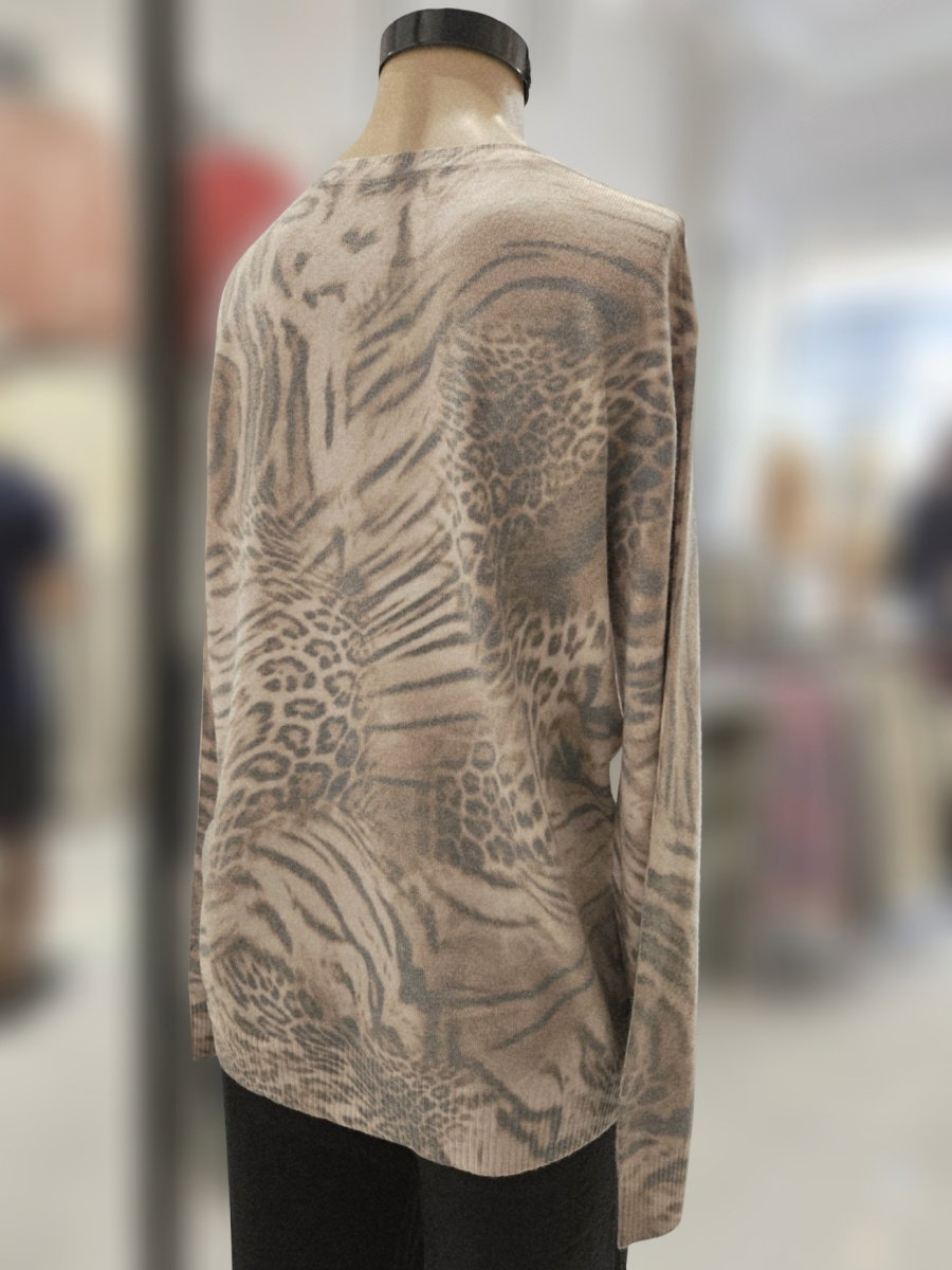 Sweater de tejido fino con estampa sublimada combinada. Escote redondo, mangas largas y calce recto. Terminaciones en rib en puños, cuello y base. Diseño con mezcla de patrones orgánicos y animal print distribuidos en toda la prenda.
