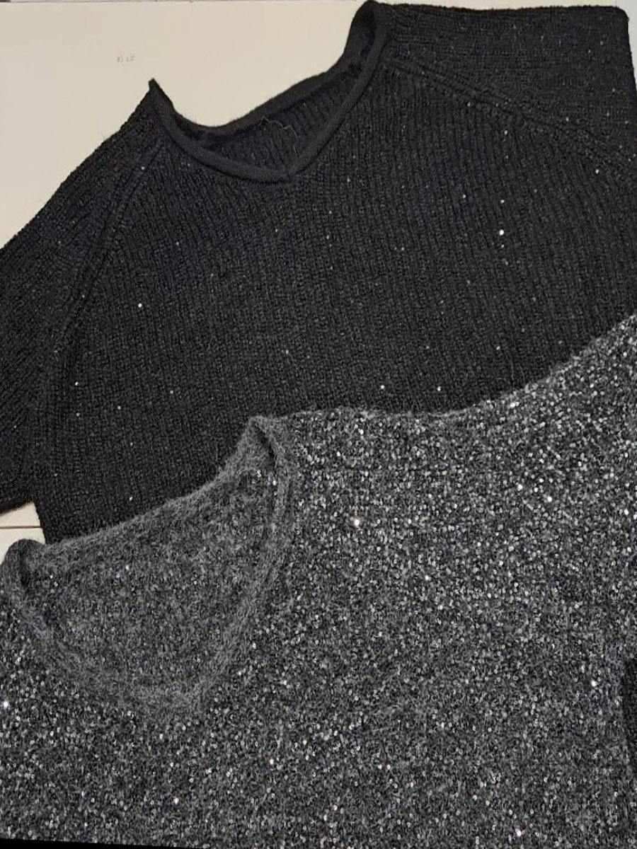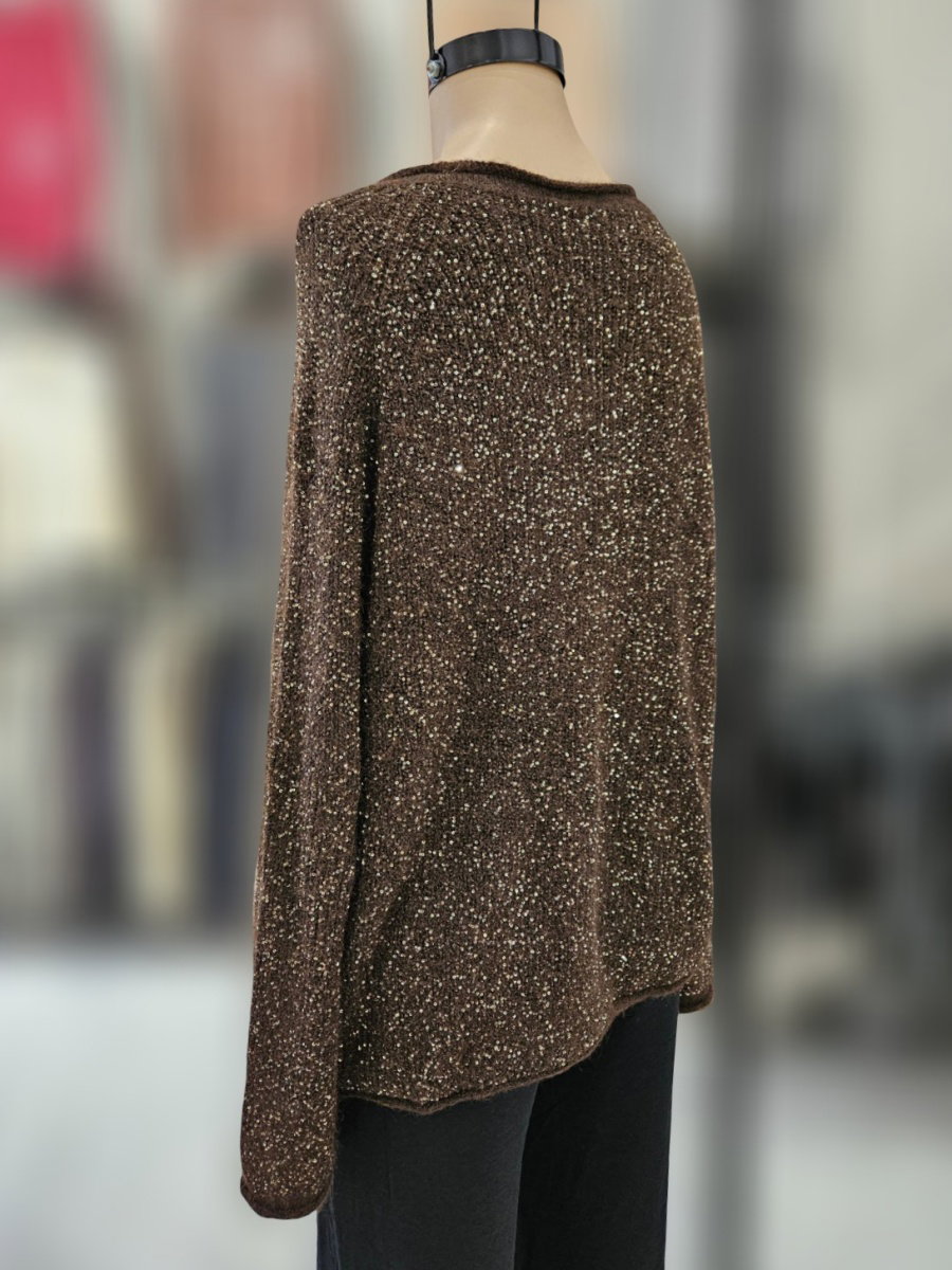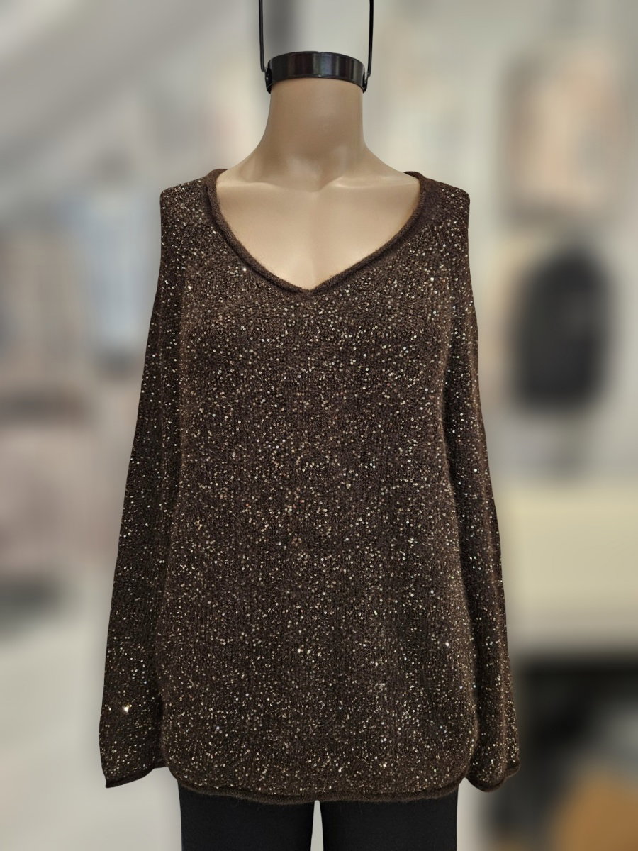 Sweater de tejido con superficie cubierta de mini lentejuelas. Escote en V con borde tejido. Manga larga con caída recta y hombro levemente caído. Estructura sin recortes visibles. Calce suelto y largo a la cadera con ruedo recto. Espalda con igual terminación.