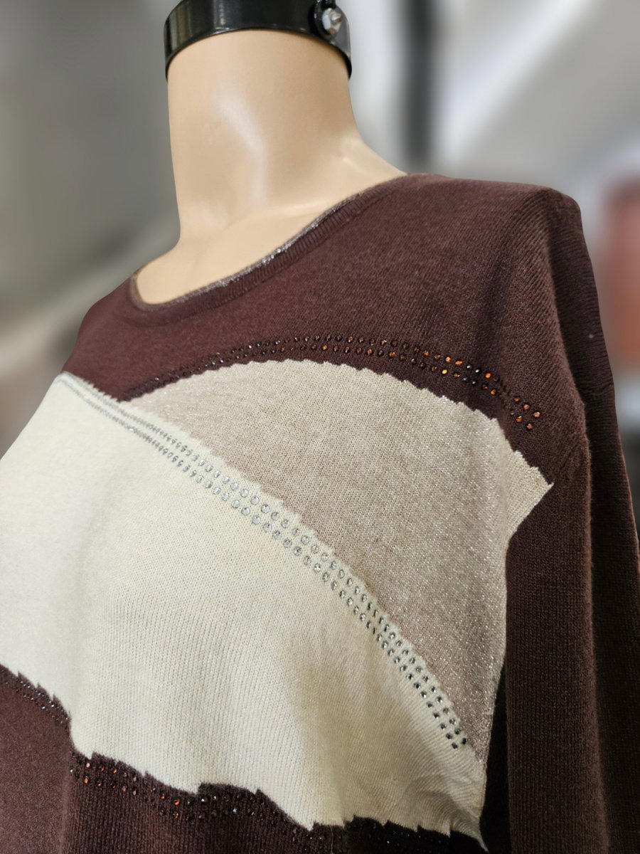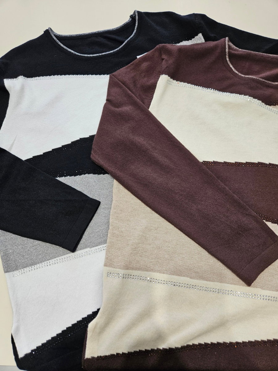 Sweater de manga larga con cuello redondo y calce amplio. Diseño con recortes diagonales en bloques y líneas de tachas aplicadas sobre las uniones. Tejido de punto fino con terminaciones rectas y leve caída en el bajo.