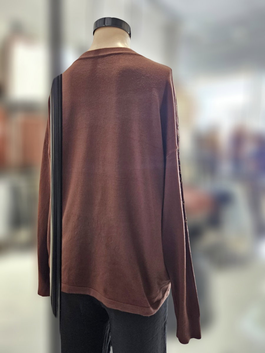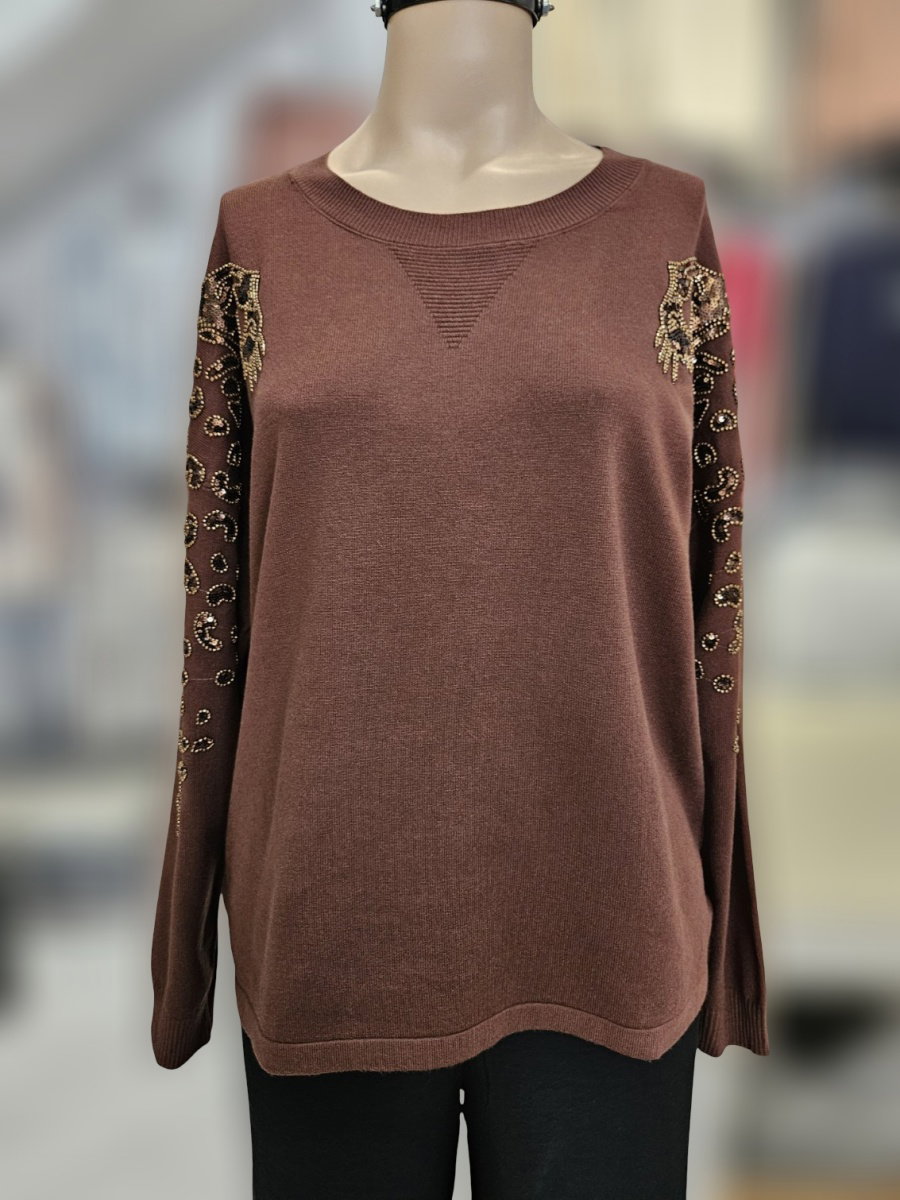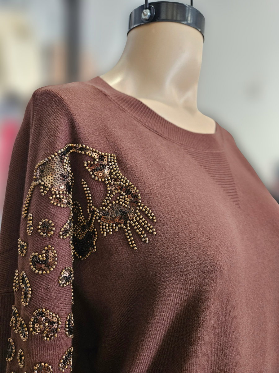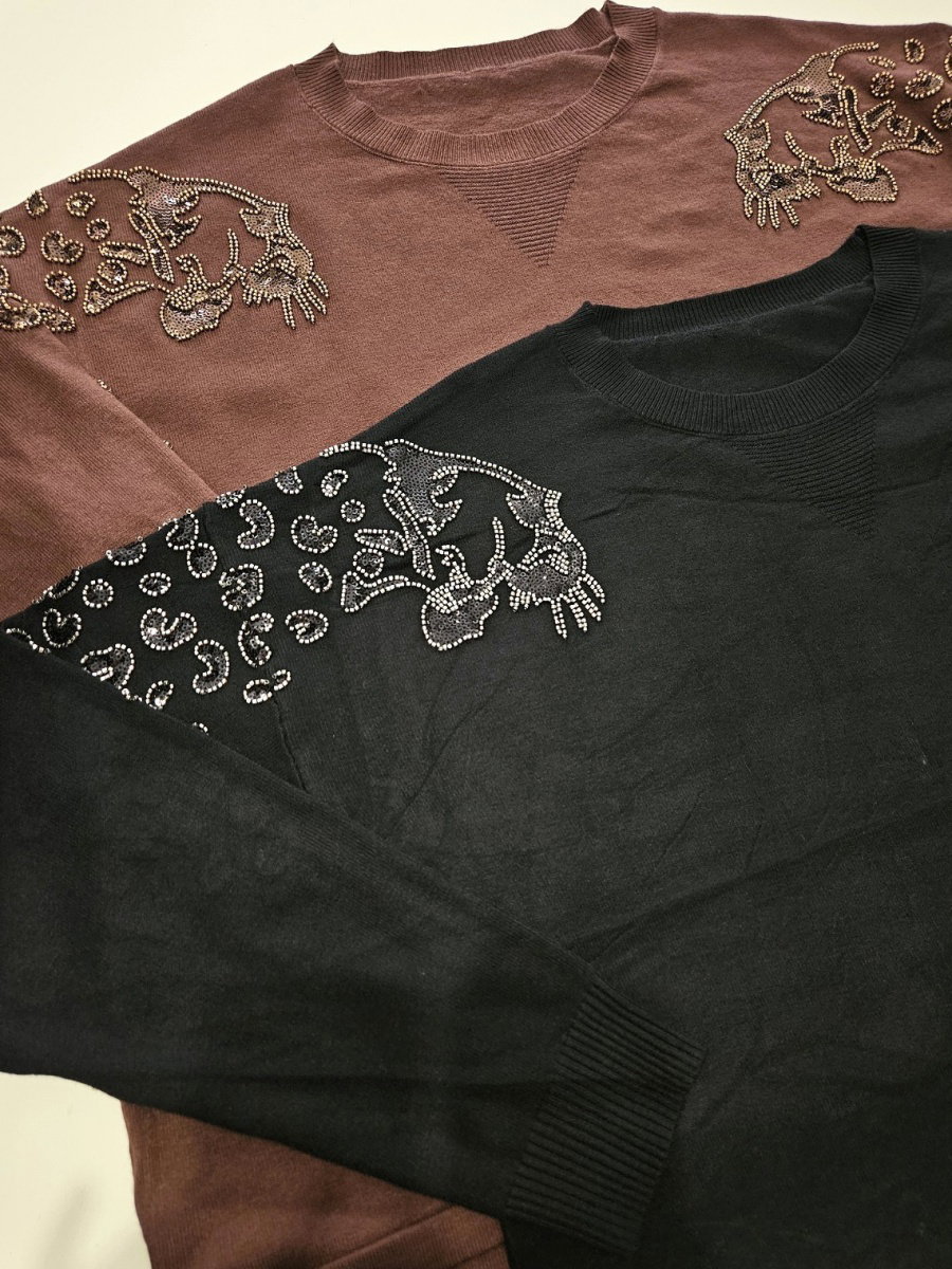Sweater de manga larga con cuello redondo y calce recto. Presenta aplicaciones de mostacillas y lentejuelas en mangas y sector de hombros. Tejido de punto fino con terminaciones rectas y bajo levemente curvo.