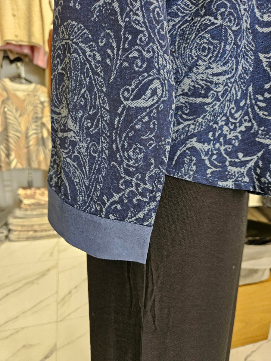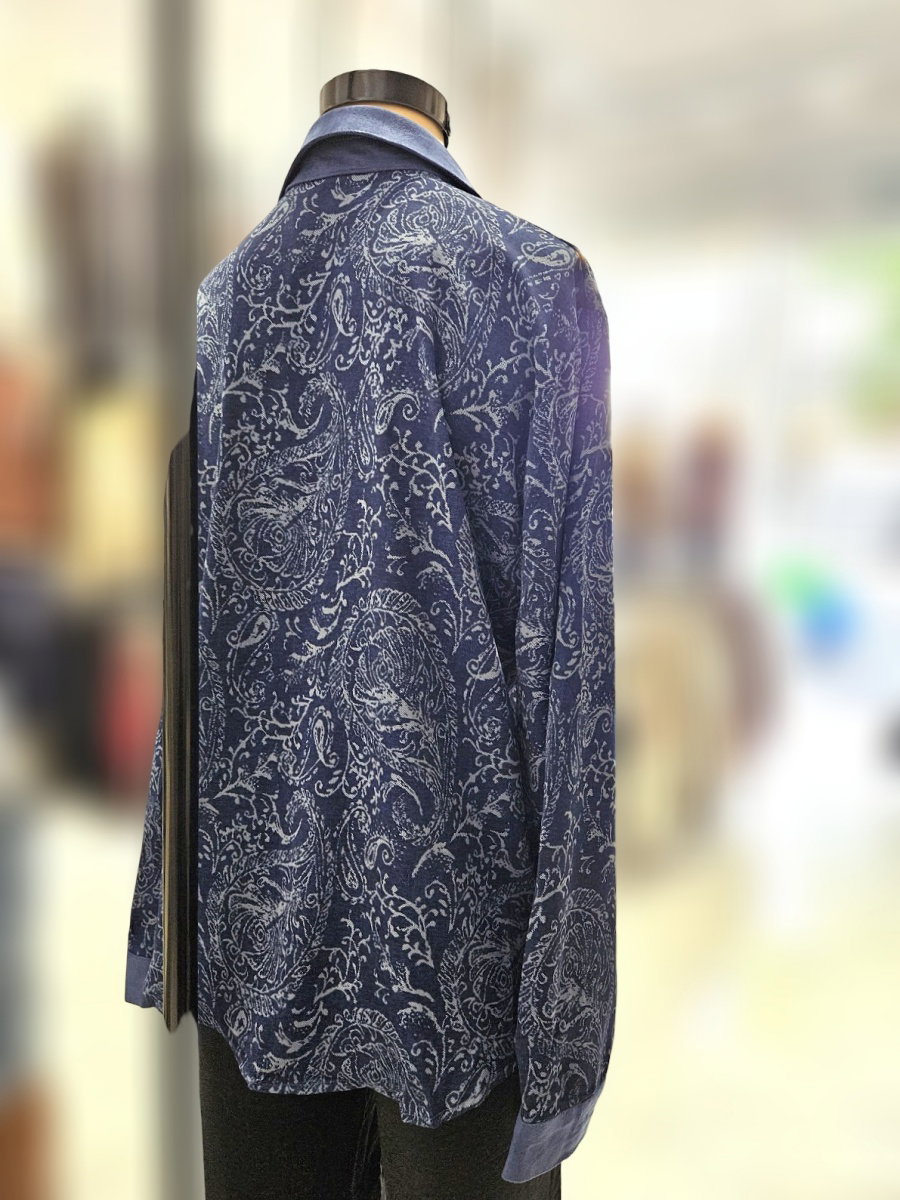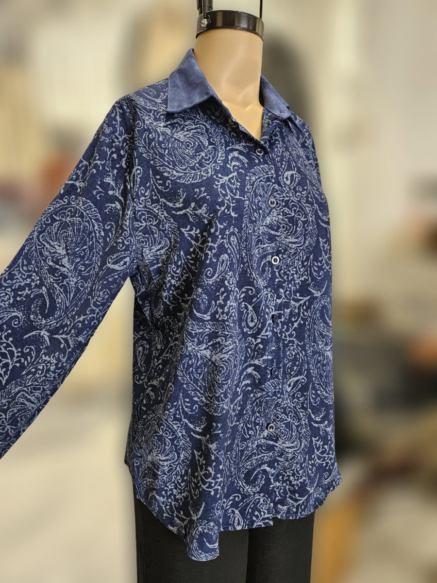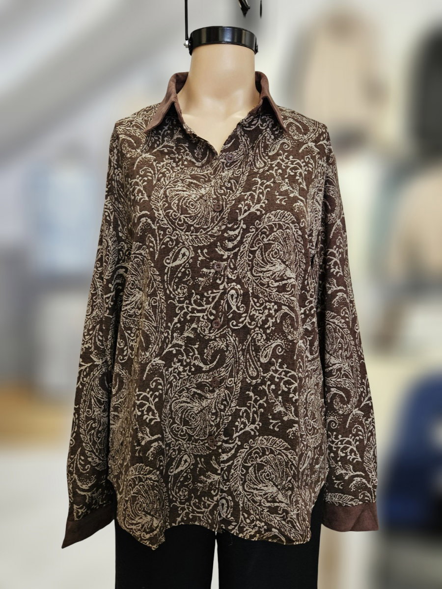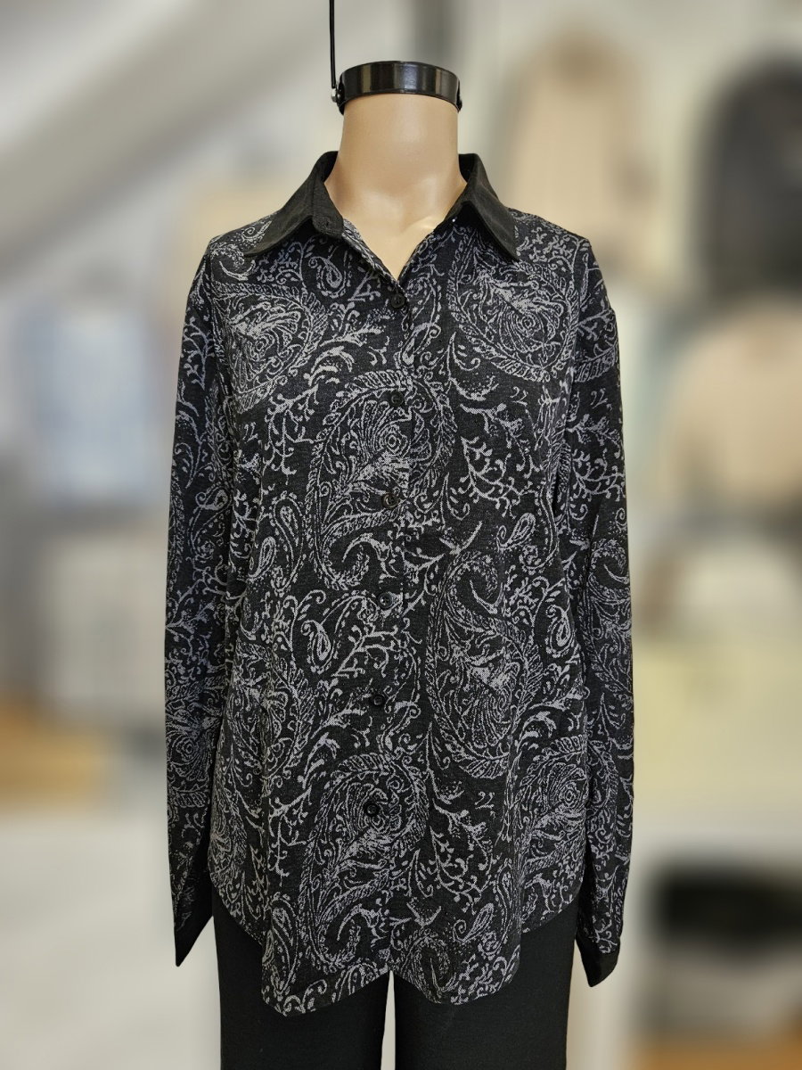 Camisa de manga larga con cuello clásico y cierre frontal mediante botones. Presenta estampa integral de motivo búlgaro distribuido en toda la prenda. El diseño incluye puños y cuello en material diferenciado tipo gamuzado, con terminación lisa que contrasta con el cuerpo estampado. Calce recto con caída suelta, hombros definidos y bajo levemente curvo con aberturas laterales.
