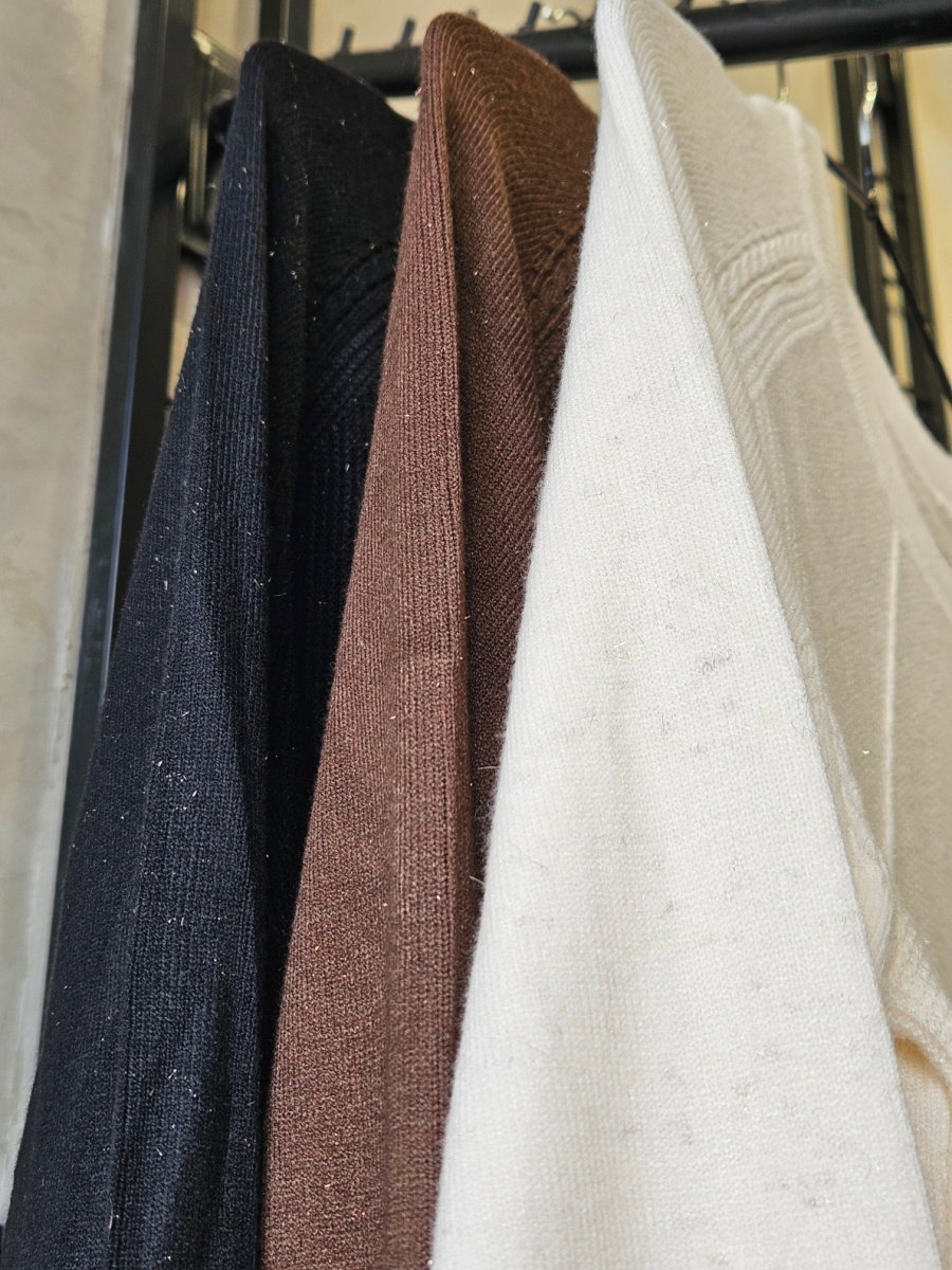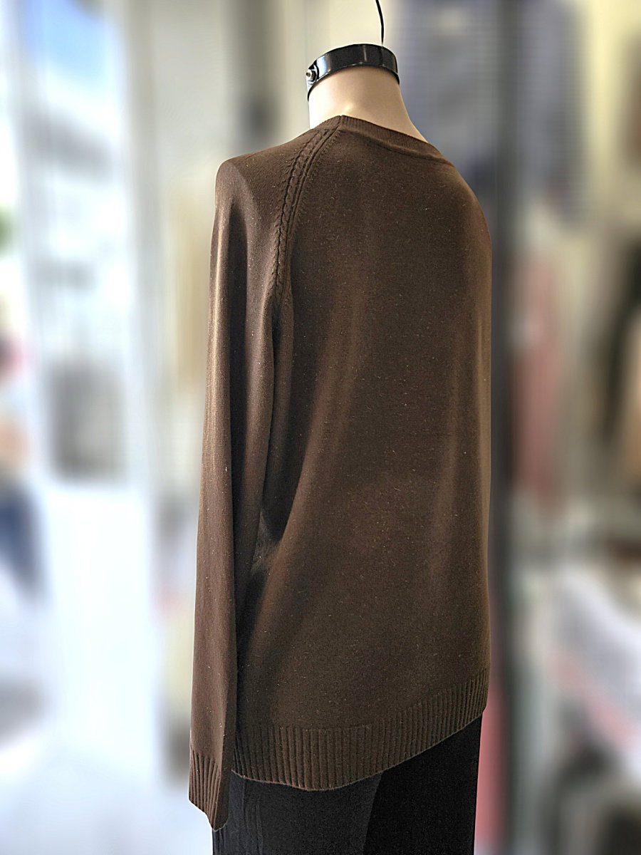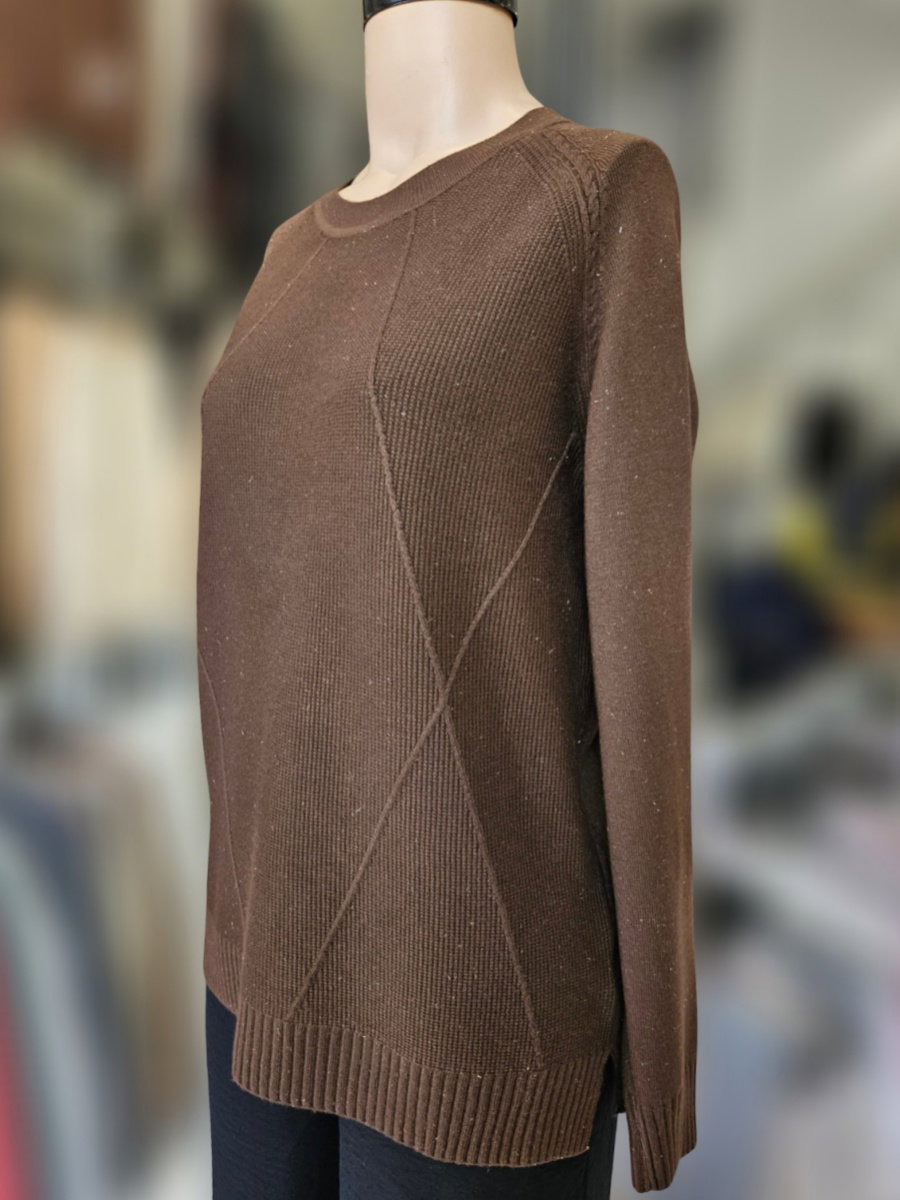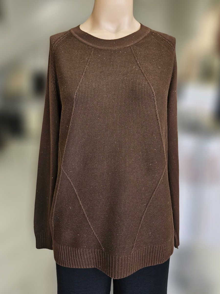 Sweater de tejido de punto, con silueta recta y largo a la cadera. Presenta cuello redondo tejido en rib y mangas largas con unión tipo ranglán. El frente incorpora diseño de rombo generado por variaciones en el tejido, integrado de forma continua en la superficie. La espalda es lisa, sin recortes. Puños y terminación inferior en rib. Superficie de trama fina y uniforme.