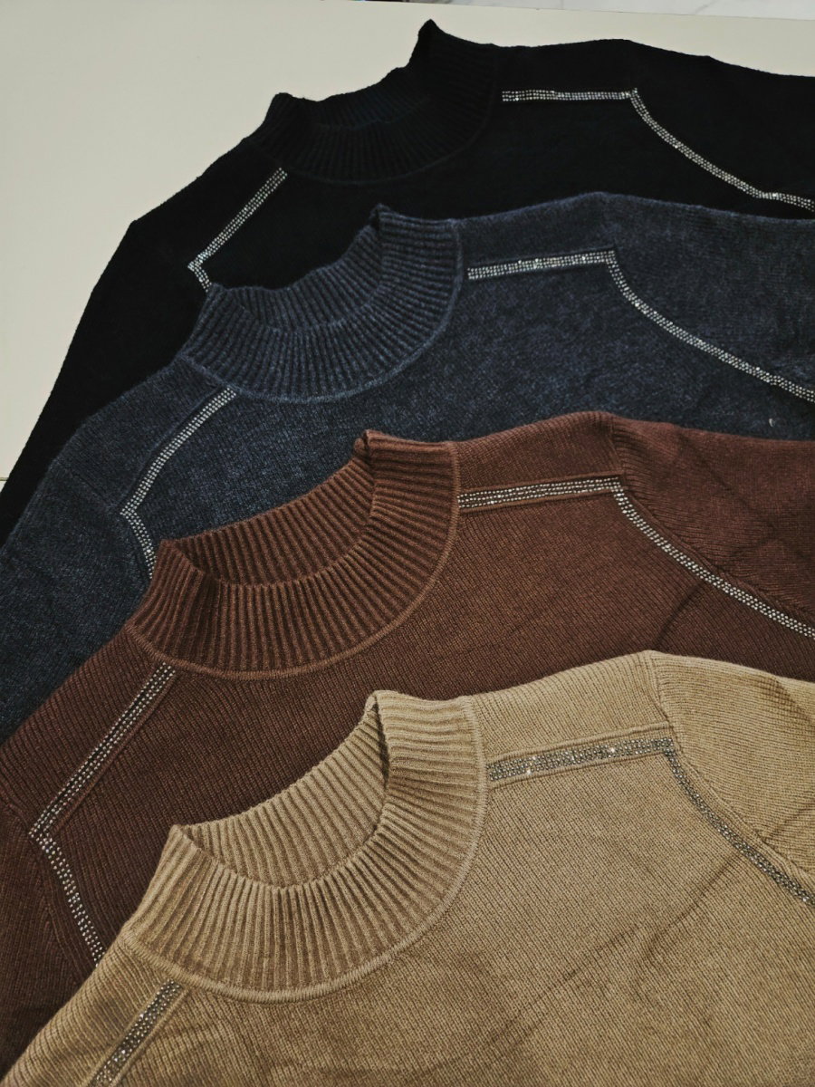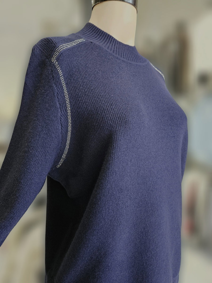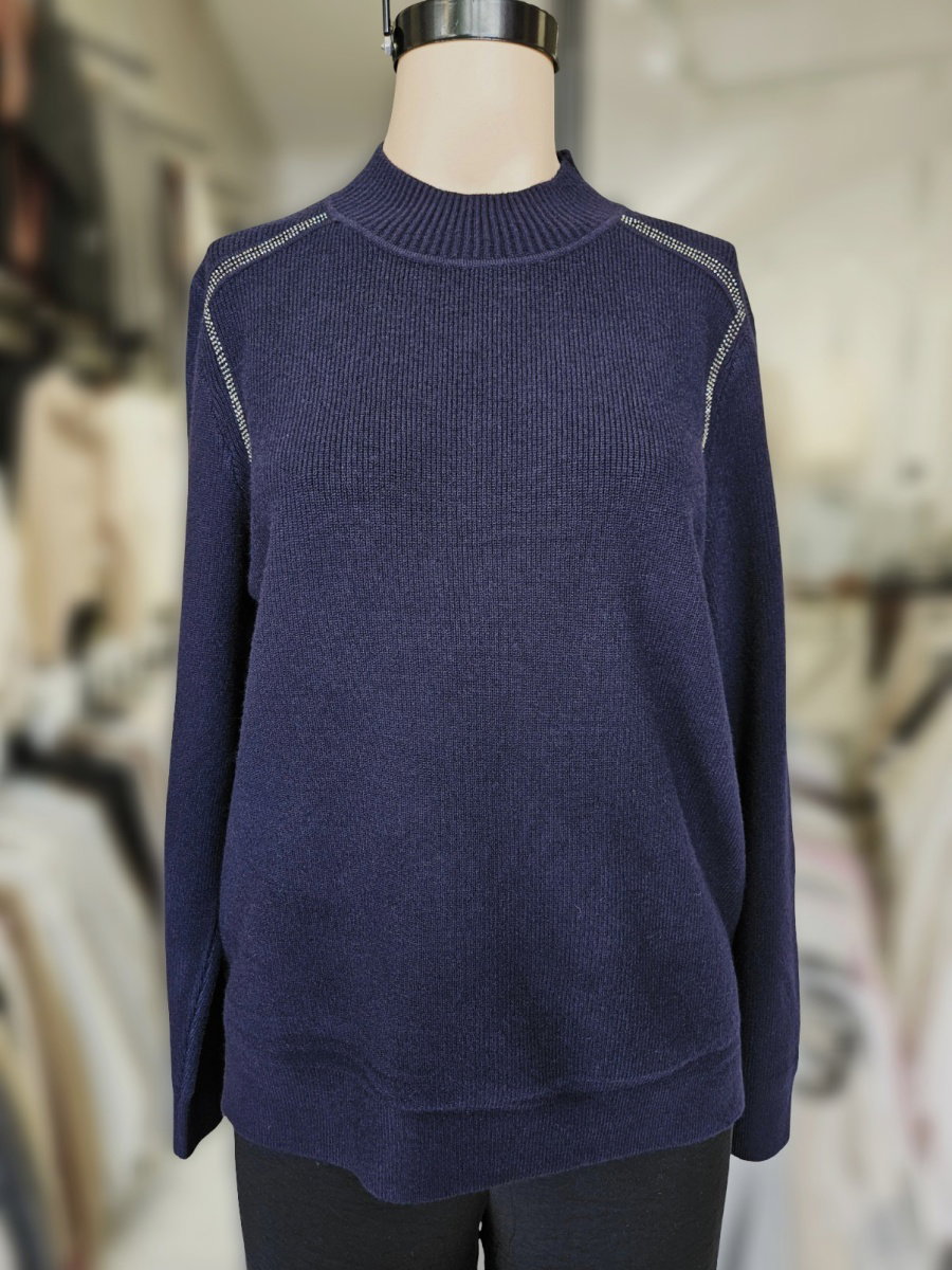 Sweater de punto con silueta recta y largo a la cadera. Presenta cuello alto en rib y mangas largas tipo ranglán. Incorpora aplicación de strass en líneas que recorren los hombros. Terminaciones en rib en cuello, puños y borde inferior.