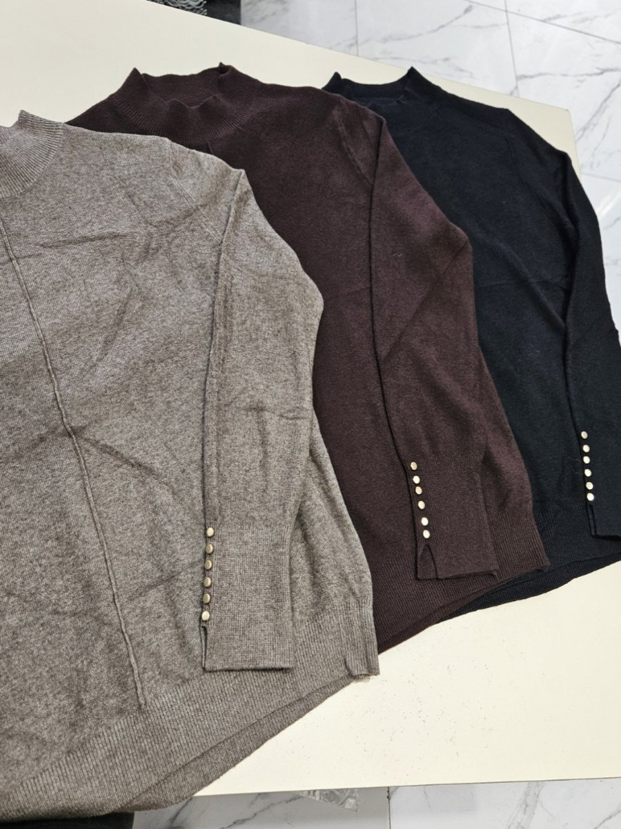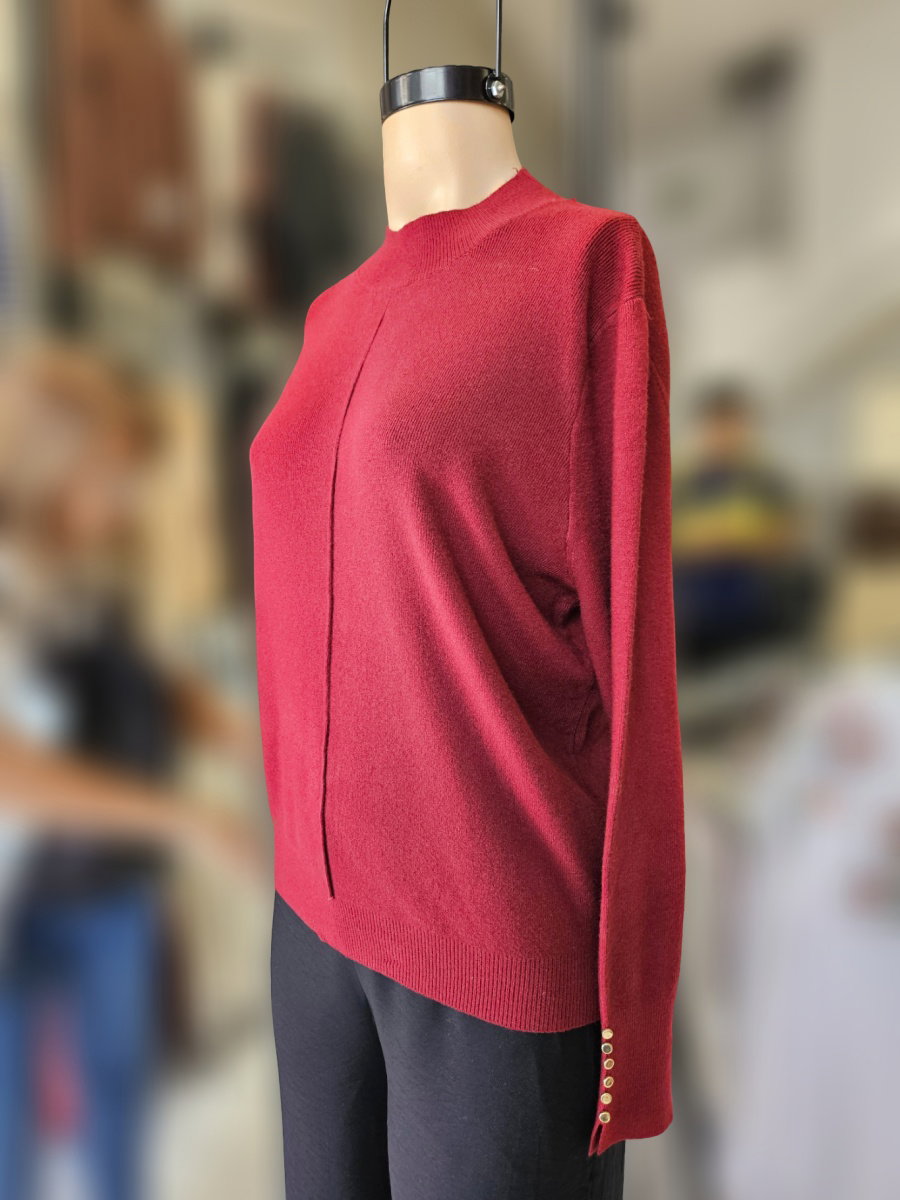 Sweater de punto con silueta recta y largo a la cadera. Presenta cuello alto y mangas largas. El frente incorpora una línea central generada por variación en el tejido. Puños en rib con abertura y aplicación de botones. Espalda lisa y terminación inferior en rib.