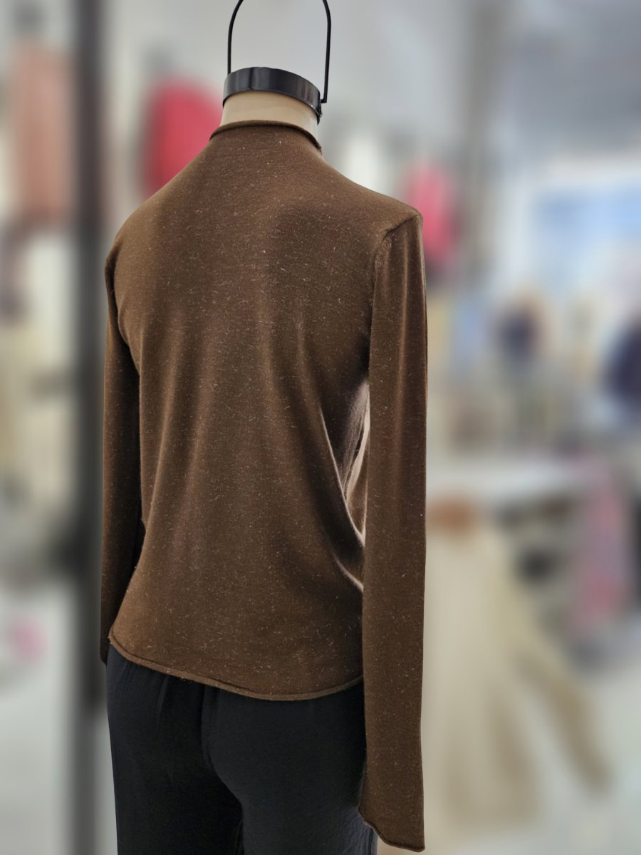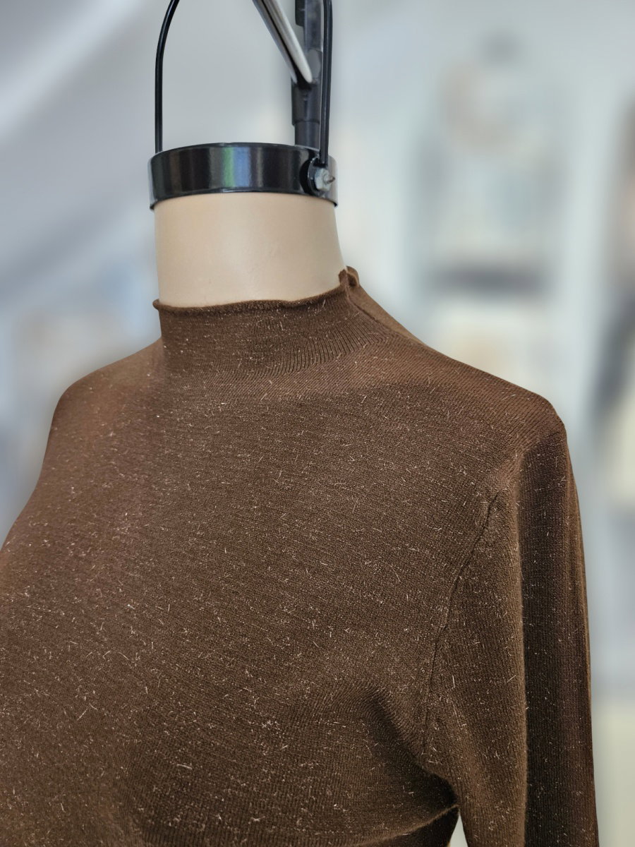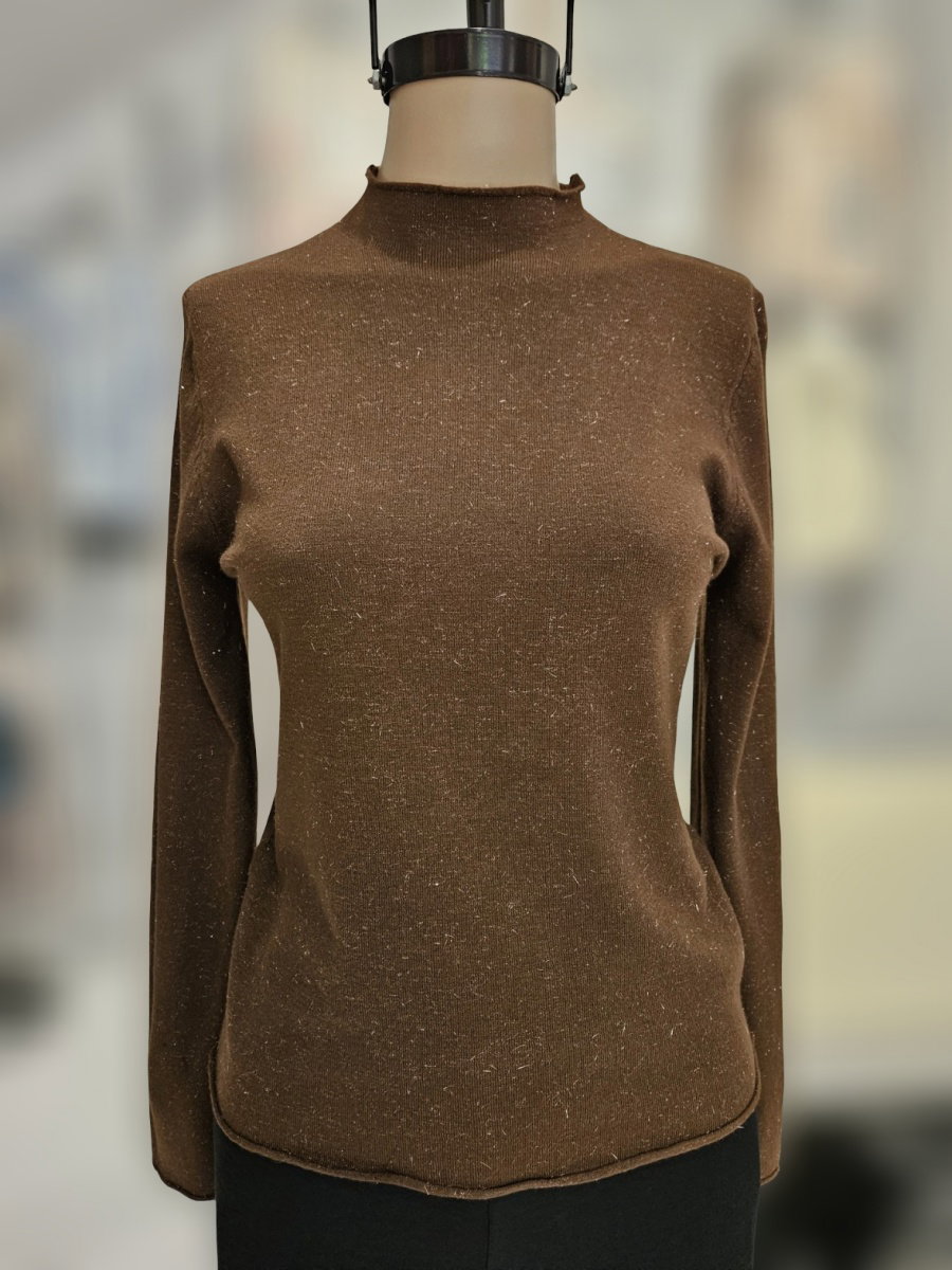 Sweater de punto con silueta recta y largo a la cadera. Presenta cuello alto corto y mangas largas. Confeccionado en tejido con hilado de lurex visible en la superficie. Terminaciones al corte en cuello, puños y borde inferior. Espalda lisa, sin recortes.