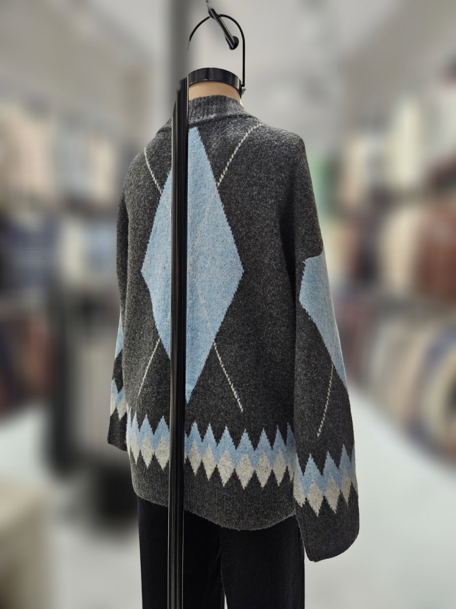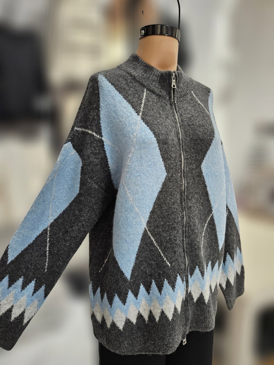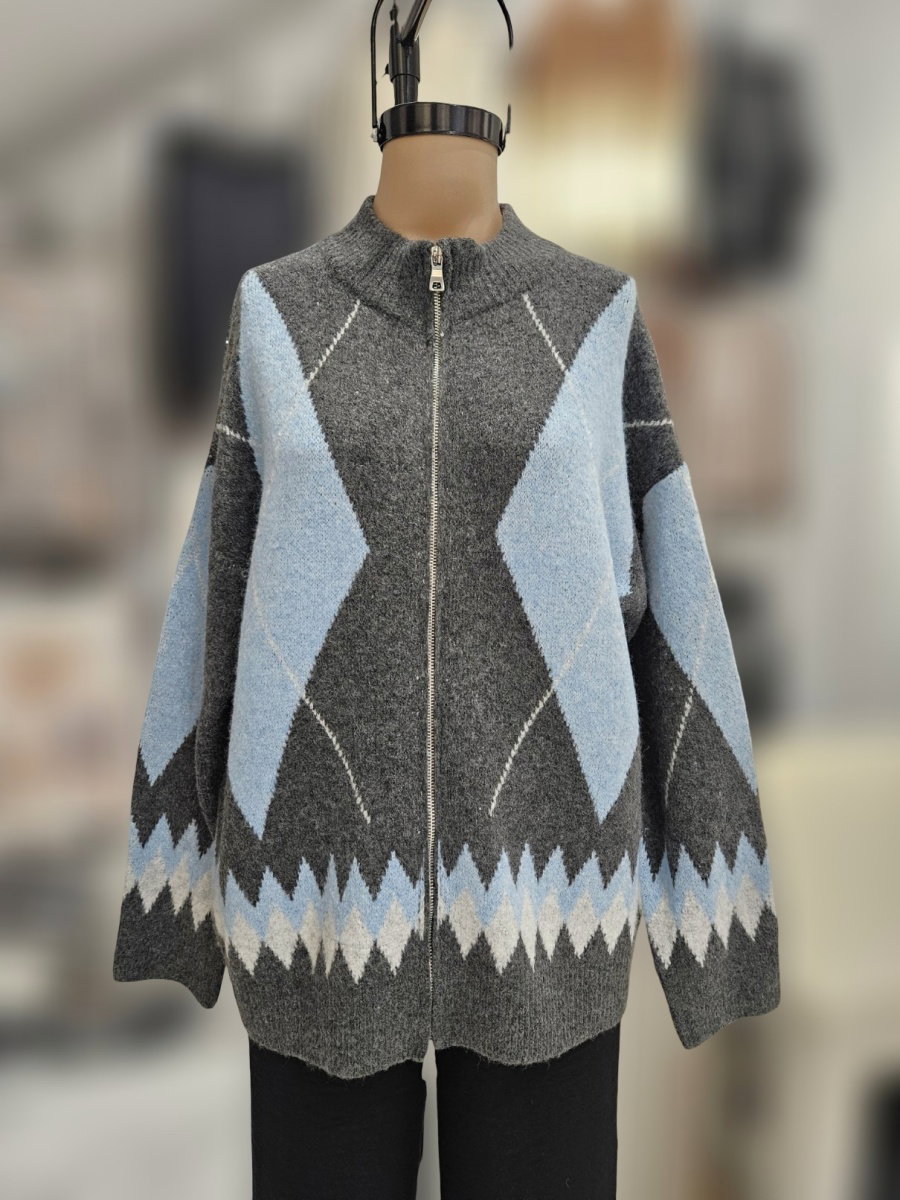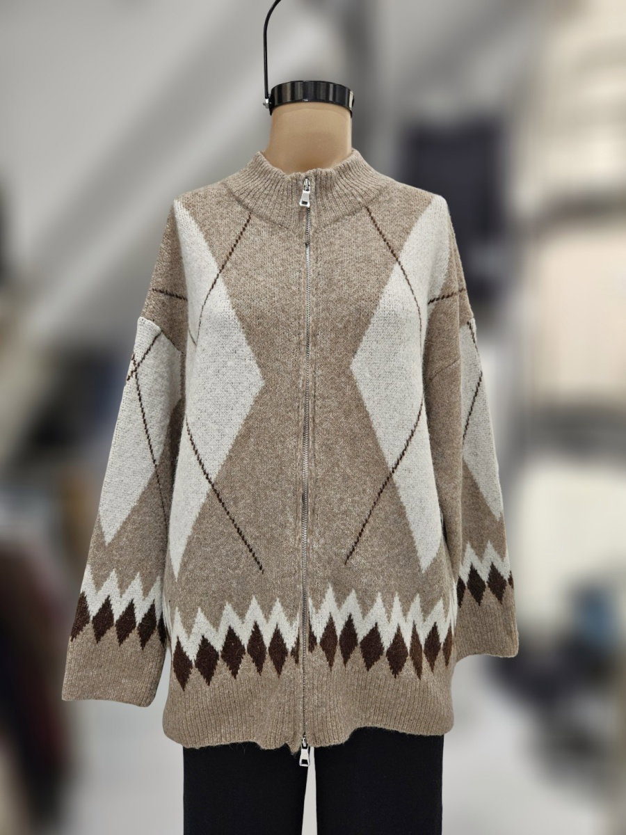 Saco de punto con silueta recta y largo a la cadera. Presenta cuello alto en rib y mangas largas. Abertura frontal con cierre doble. El diseño incorpora motivo de rombos de gran escala en frente, espalda y mangas, con guarda geométrica en el borde inferior.