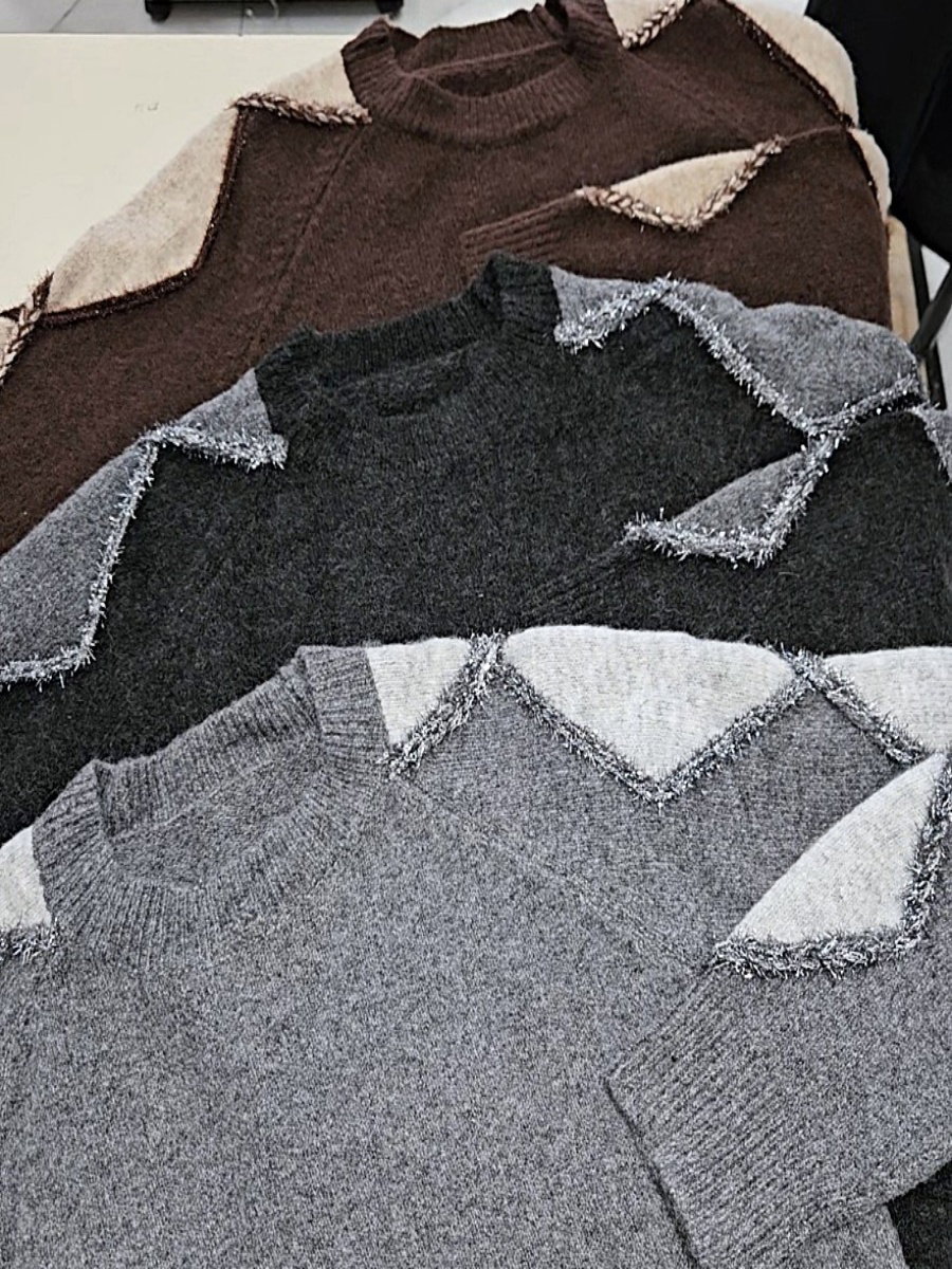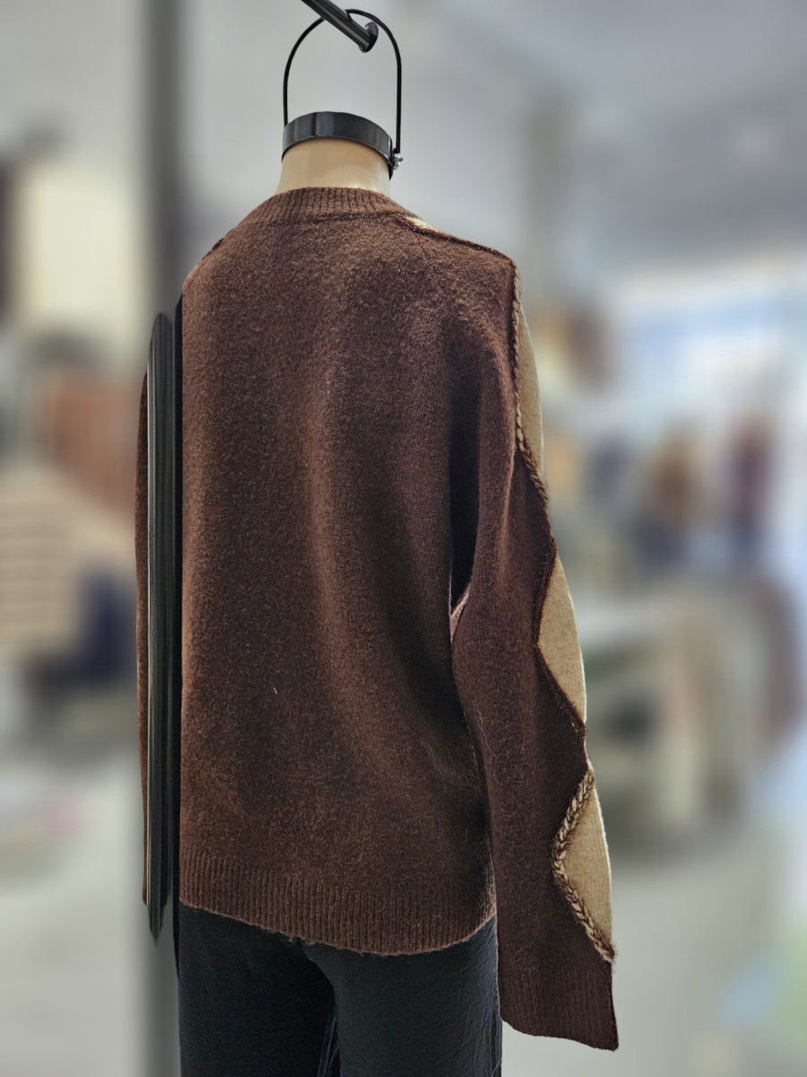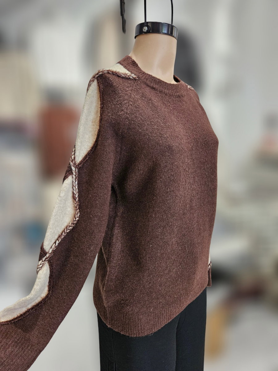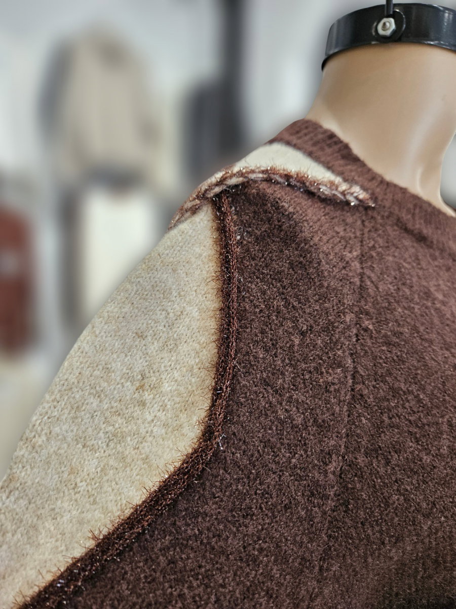 Sweater de tejido con cuello redondo y manga larga. Presenta recortes en mangas con aberturas y piezas en forma triangular en contraste, con terminaciones desflecadas y detalle de lurex. Terminaciones acanaladas en cuello, puños y cintura. Calce recto.