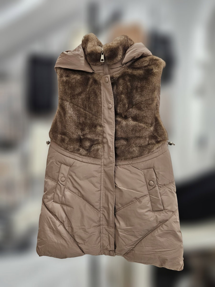 Chaleco largo con exterior combinado en dos texturas. Presenta capucha desmontable con cierre, cuello alto y apertura frontal con cierre y cartera con broches a presión. La parte superior es de textura tipo piel sintética y la inferior de material acolchado con pespuntes. Incluye bolsillos frontales con tapa y broche.