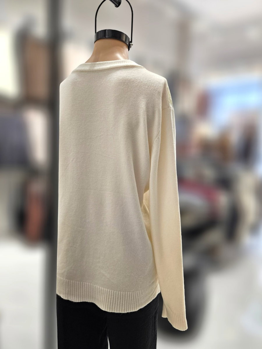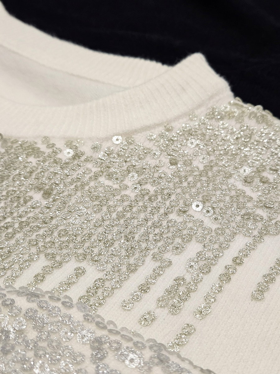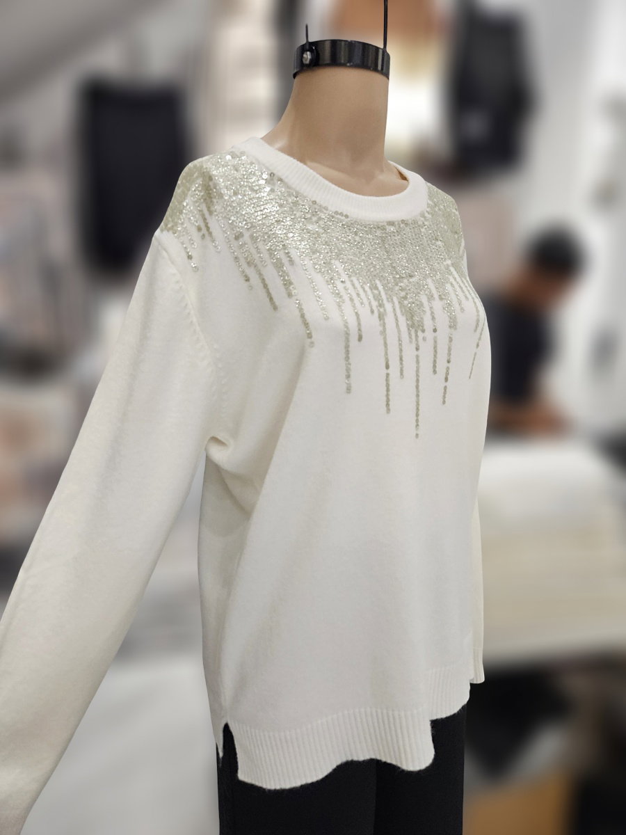 Sweater tejido de calce recto con escote redondo. Presenta aplicación frontal de lentejuelas dispuestas en caída vertical desde el escote. Espalda lisa sin detalles.