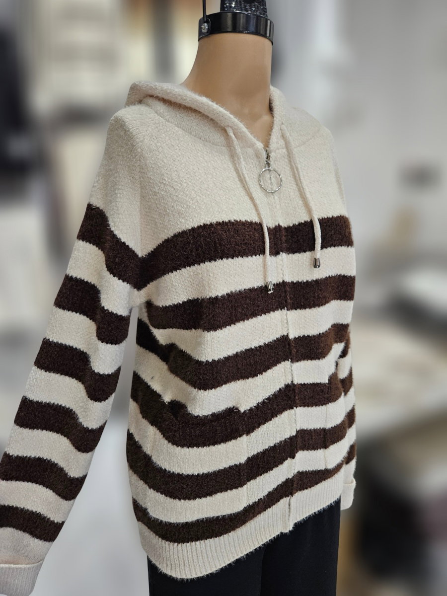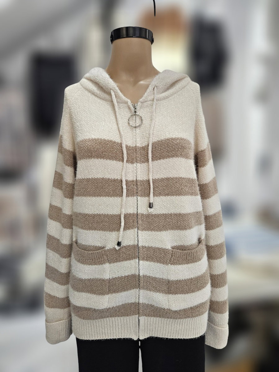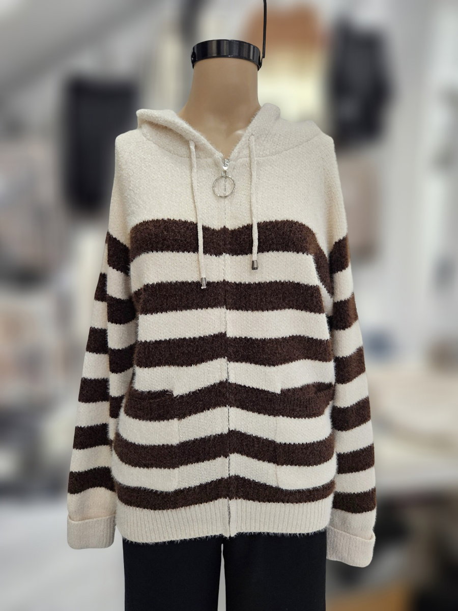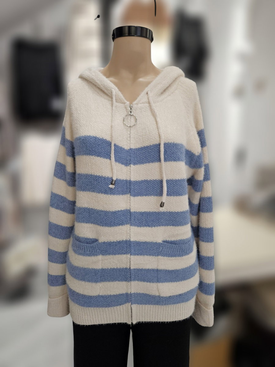 Saco tejido con calce recto y largo medio. Presenta capucha con cordones ajustables y cierre frontal con tirador metálico. Diseño de rayas horizontales en todo el cuerpo y mangas. Incorpora bolsillos frontales de formato cuadrado aplicados
