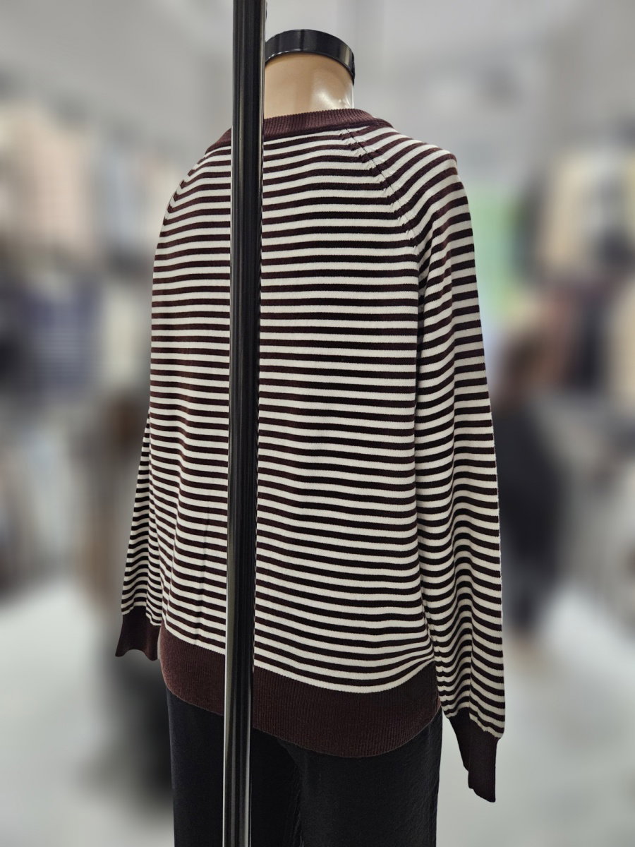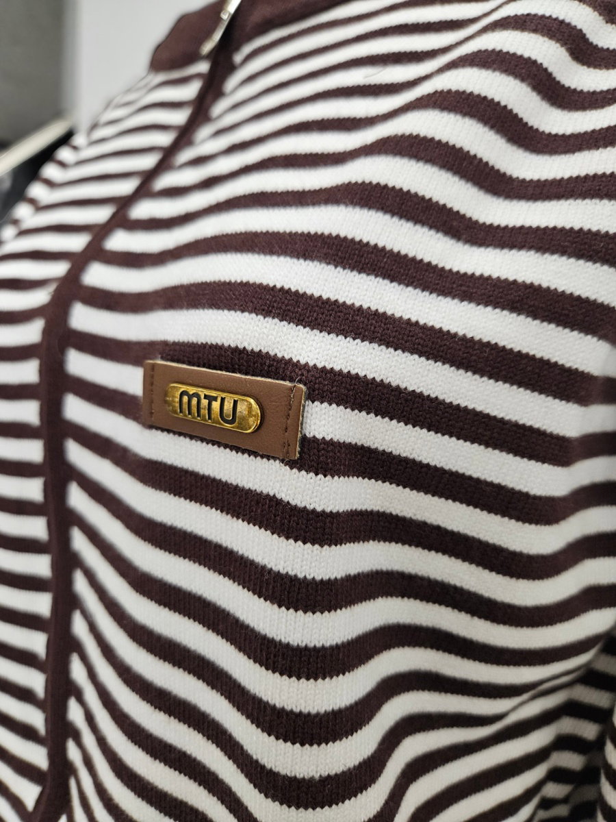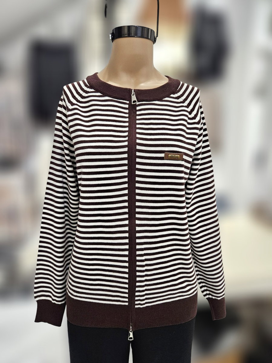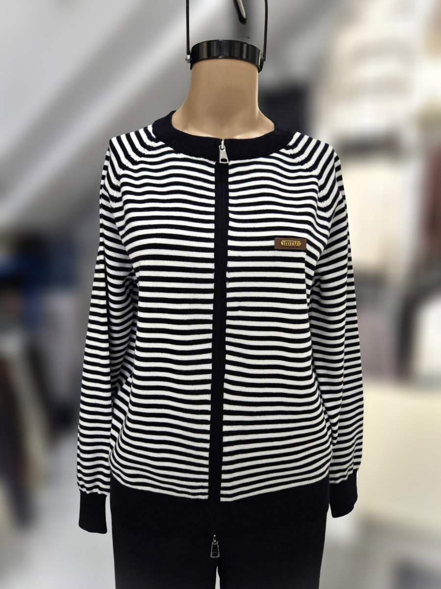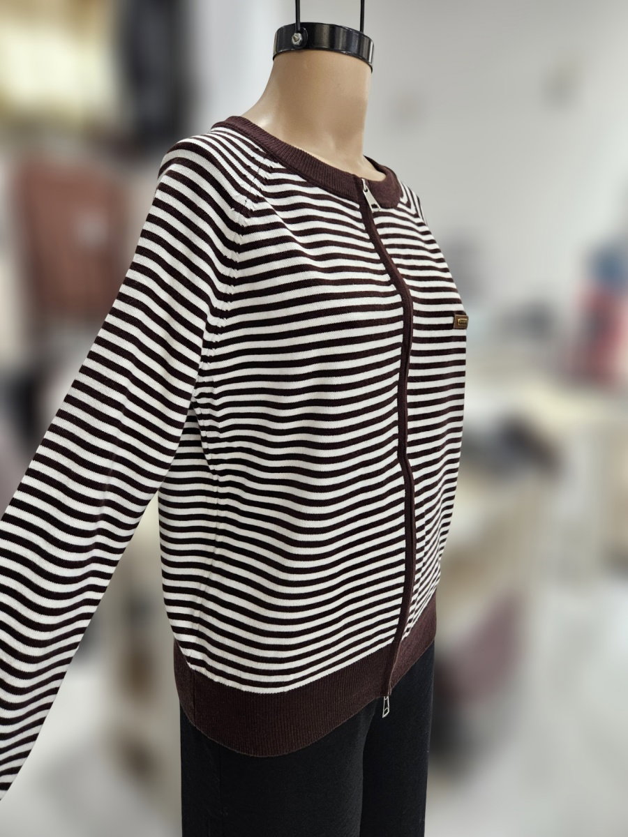 Saco tejido recto con cierre frontal y escote redondo. Rayado horizontal en todo el cuerpo. Puños y cintura en rib. Lleva etiqueta aplicada en el frente.